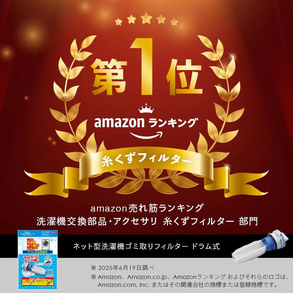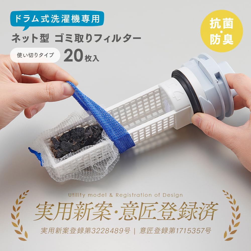 排水口の詰まり対策!ゴミを絡めとってお手入れラクラク!ドラム式洗濯機専用のゴミ取りフィルター用ネットです。目の細かいネットで小さなゴミもキャッチ。抗菌・防臭加工。使い切りタイプ20枚入。 【使用方法】1.ゴミ受けについているゴミをきれいに取り除いてください。2.ゴミ受けにワンタッチテープを取り付けてください。3.ネットをかぶせたらワンタッチテープにくっつけて洗濯機にセットします。