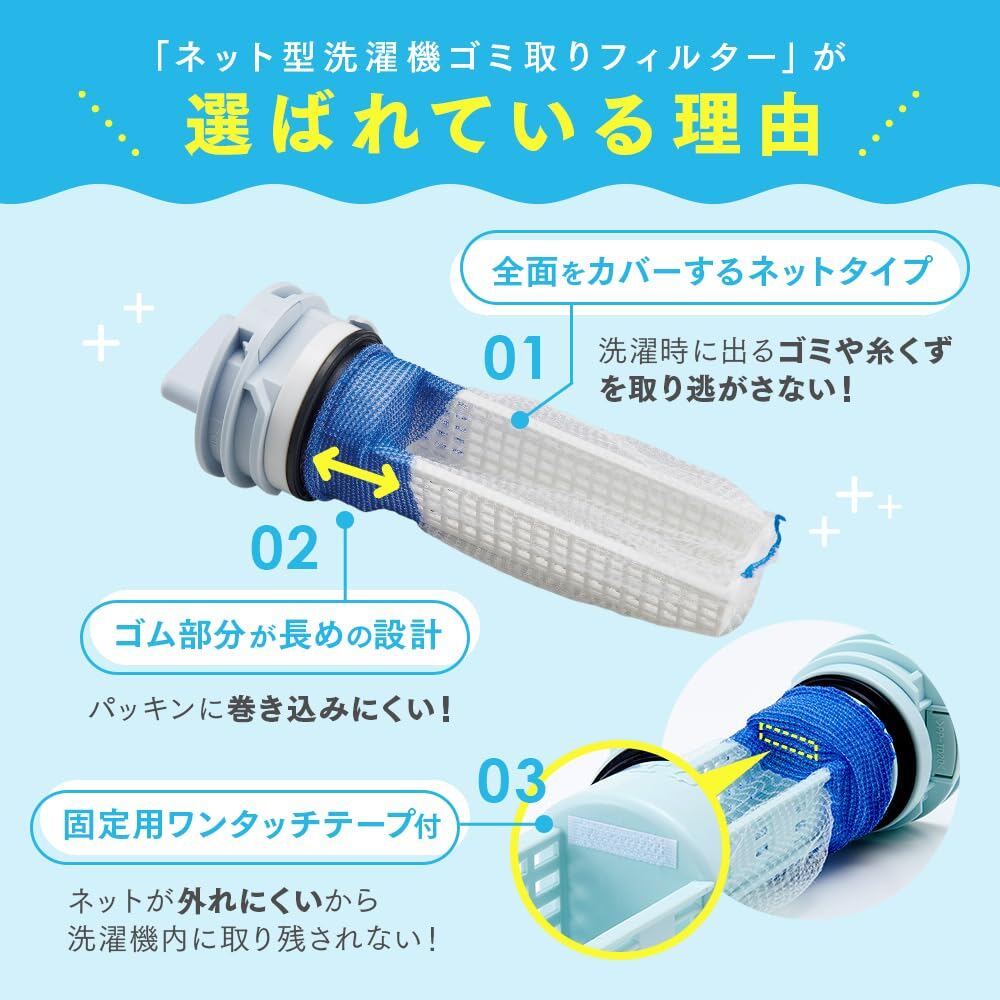 【使用上の注意】・本品はドラム式洗濯機用です。 用途以外には使用しないでください。・ネットが汚れた状態や、ゴミがいっぱいのまま継続して使用しますと、ネットが目詰まりして、水のあふれやゴミ詰まり等のエラーの原因となります。・数日程度での定期的な交換をお勧めします。・洗濯機のゴミ受けの大きさによっては、取り替え頻度が早くなる場合があります。 また、洗濯物の量や衣類の種類によっては、1回の使用でゴミ受けがいっぱいになることがあります。・ワンタッチテープは必ず使用し、「取り外し」はゆっくり行ってください。 ゴミ受けへの固定が不十分な場合、または勢いよく引き出すと、ネットが穴に取り残される恐れがあります。【洗濯の途中にエラー表示が出て、運転停止になったら】・ゴミ受けや排水ホース、排水口などの排水経路に、汚れの付着や詰まりが生じると排水エラー表示やお手入れサインが出て、運転が停止する恐れがあります。・洗濯槽内に水が溜まった状態で洗濯機の扉やゴミ受けを開けないでください。 水が洗濯機外へ流れ出す恐れがありますので、必ず洗濯機の取扱説明書に従い掃除をしてください。・開ける場合は、脱水モードで排水し、念のため洗面器などを用意して水の流出に備えてください。 洗面器などで受けながらゴミ受けのつまみを少し緩め、徐々に水を出してください。