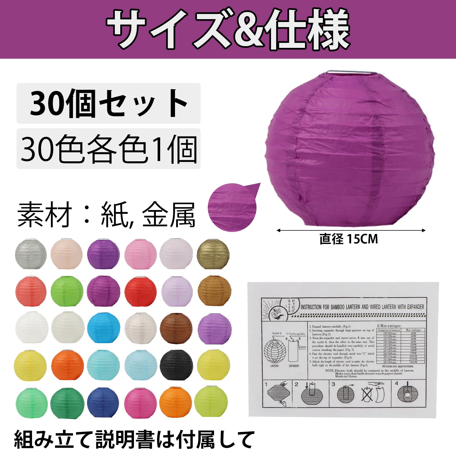 ??【仕 様】パッケージ内容:30色合計30個丸型紙提灯セット入り;サイズ:直径15cm、材質:落水紙・金属サポート。靭性と延展性に優れの提灯専用「落水紙」を採用して作られた 、高品質で長持ちします。