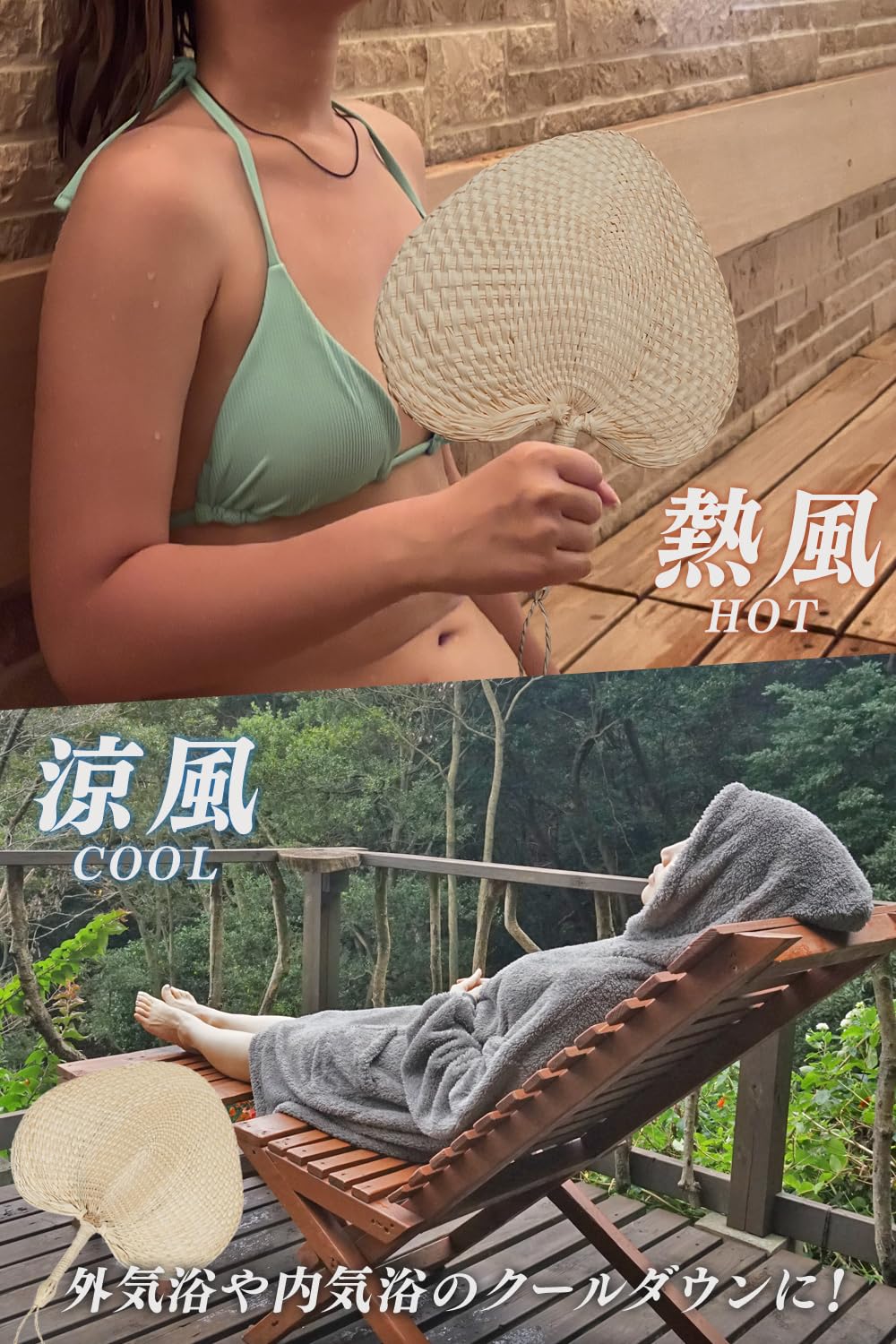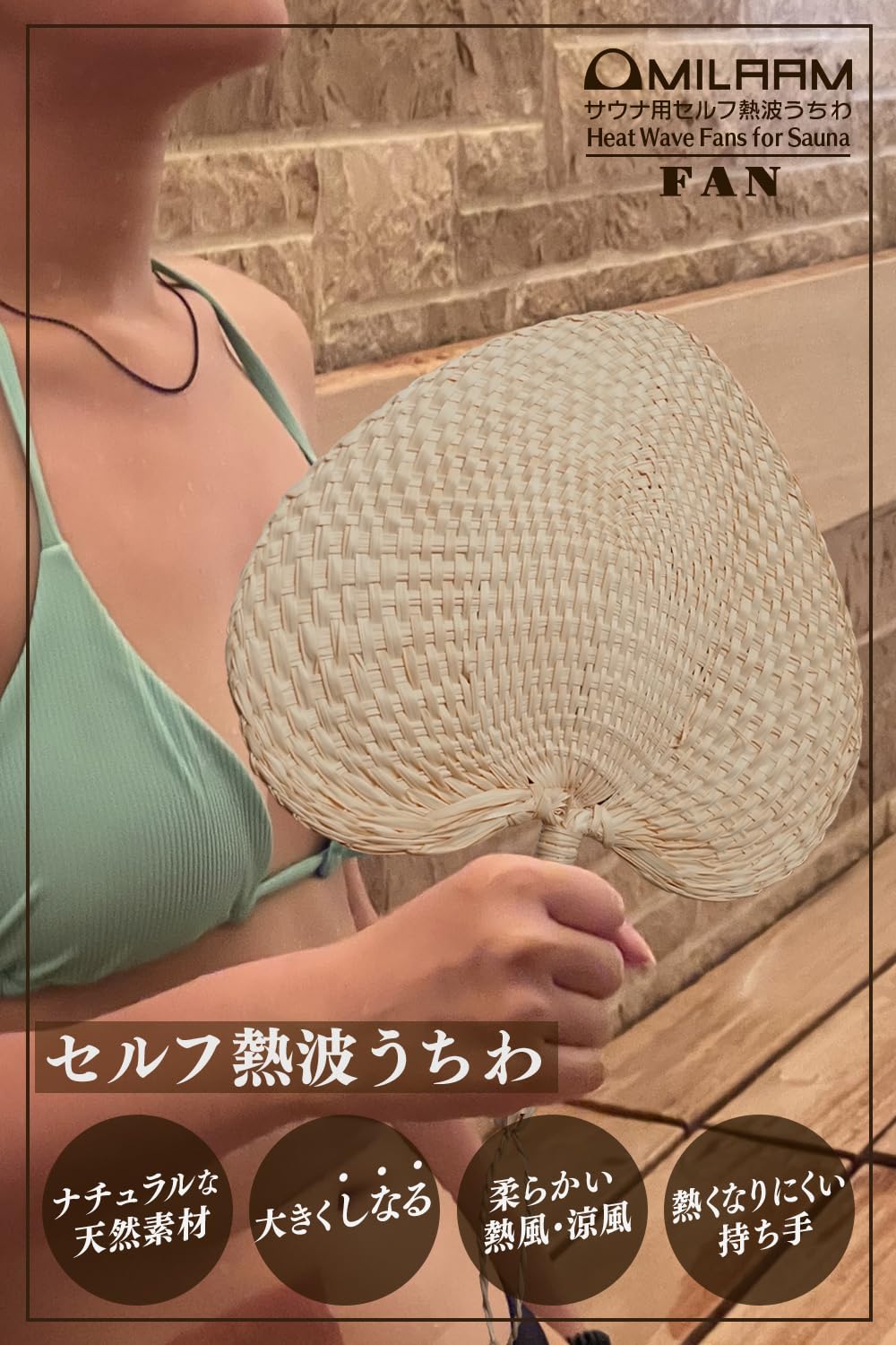 【MILAAM】 セルフ熱波うちわ 「FAN」 サウナ 熱風 涼風 天然素材 団扇 100%天然素材のガマの葉を編み込んだナチュラルなセルフ熱波うちわ。 編み込んだ形状は大きくしなるので力強い熱風で体を温めることができます。 外気浴、内気浴中にも優しい風で心地良い涼風を楽しめます。 本体サイズ:高さ約28cm(引っ掛け紐除く)・幅約25cm・厚み約1.5cm、重さ約25g。Made in China