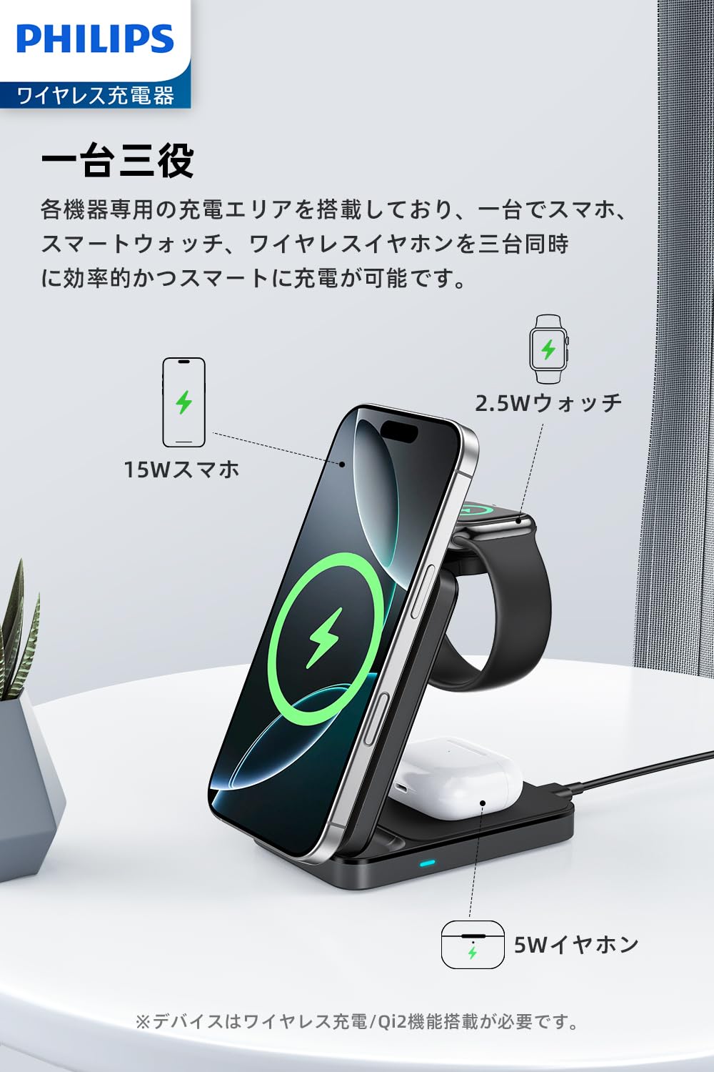 Philips (フィリップス) 3-in-1ワイヤレス充電器 Qi2対応 最大15W マグネット式 MagSafe充電器 スタンド型 スマホ/ウォッチ/イヤホン対応 置くだけ充電 折りたたみ式 iphone16/15/14/13シリーズ Androidスマホ airpods DLK3548Q