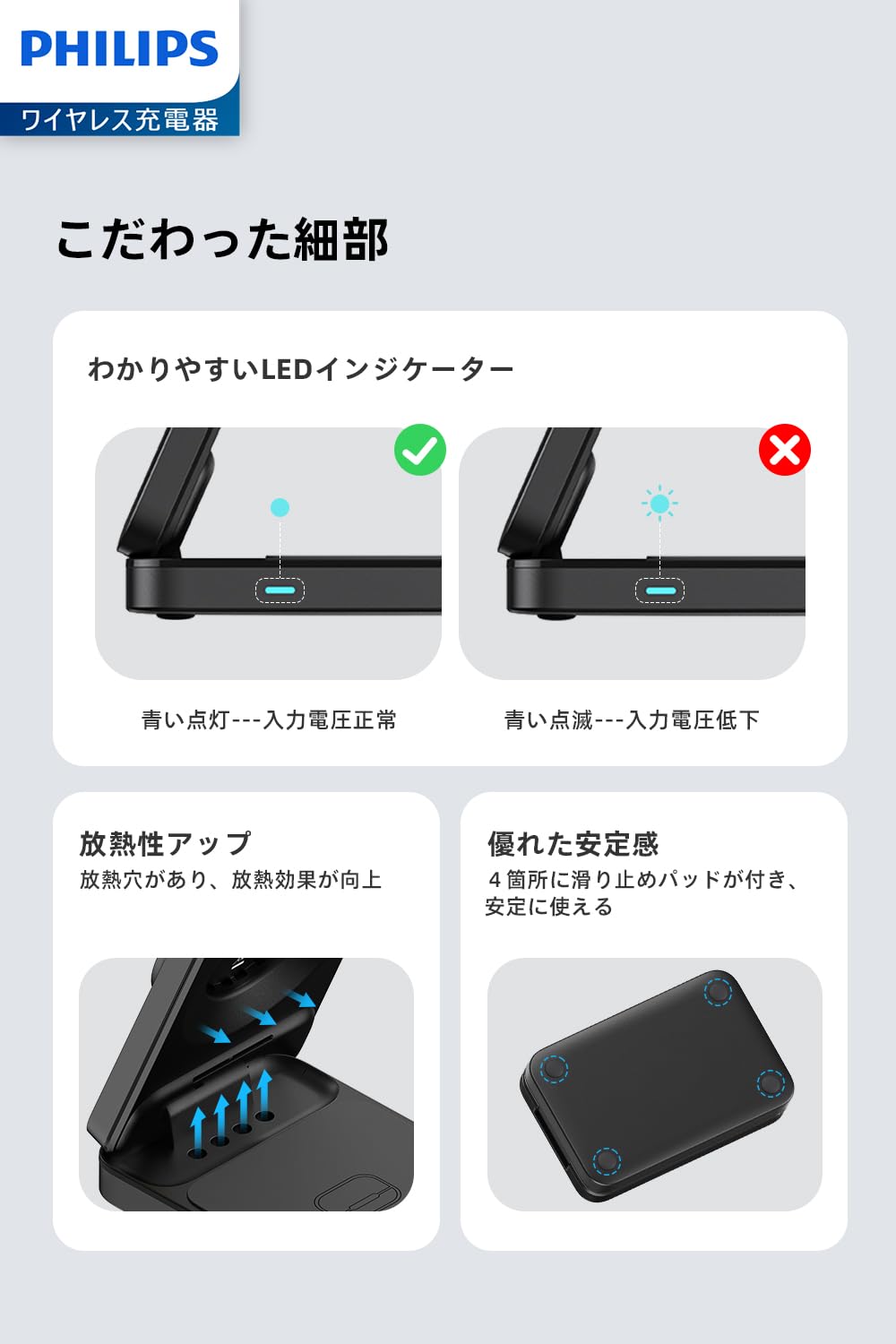 Qi2対応・最大15W:本ワイヤレス充電器のスマホ充電エリアはQi2充電技術を認証済、iphoneにもAndroidスマホにもQi2認証を取得したスマホが全てに対応します。最大15Wでワイヤレス充電が可能です。置くだけでシンプルかつ便利に急速充電ができるワイヤレス充電器です。※入力電力が不足すると、LEDインジケーターが点滅して正常に充電できません。