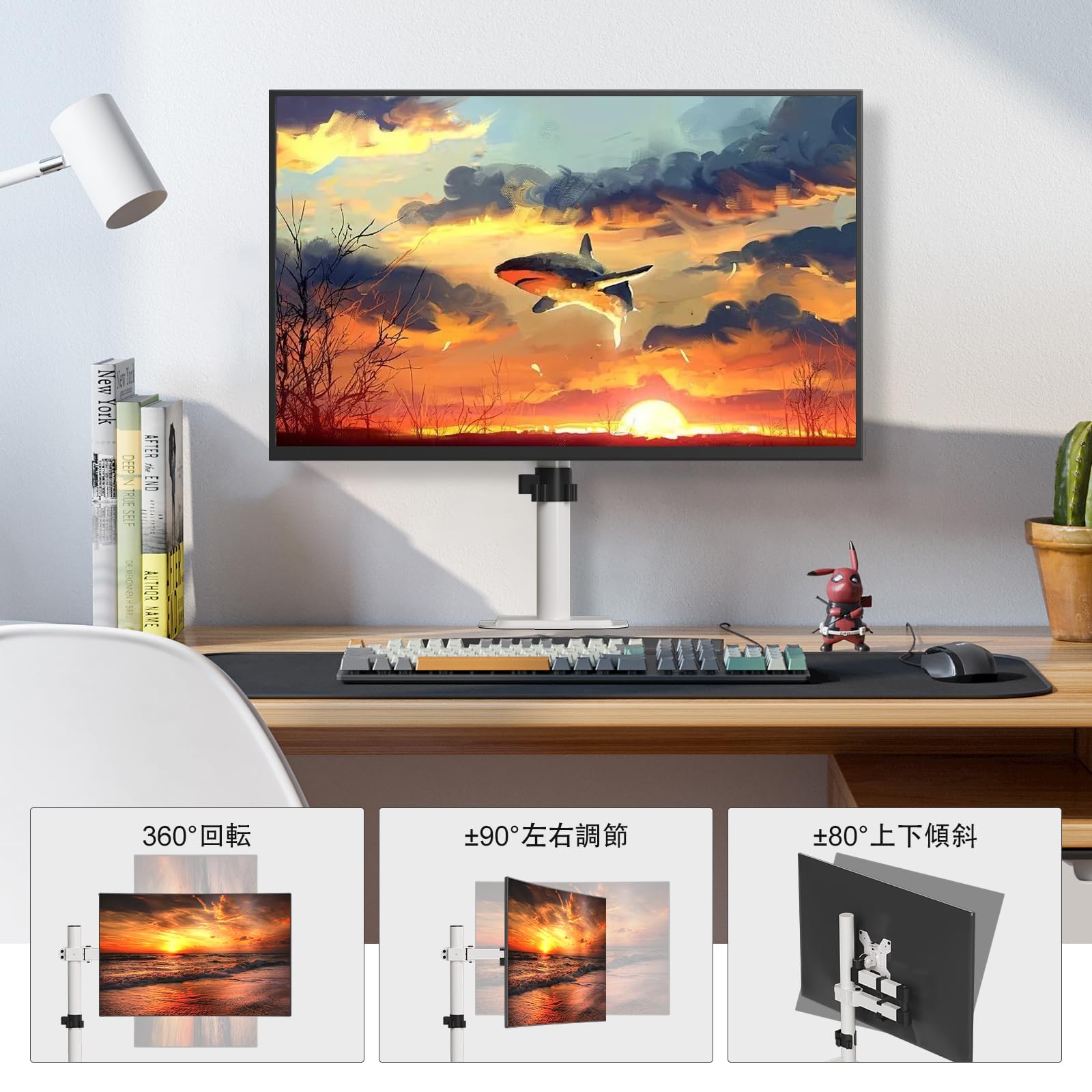 【デスク上のスペースを有効活用】モニターを設置でき、モニターの台座が不要になるため広々とデスク上を使用できます。ケーブル管理で机は清潔で綺麗に整理できます。使わないときはディスプレイアームをたたむことで机上がすっきりします。
