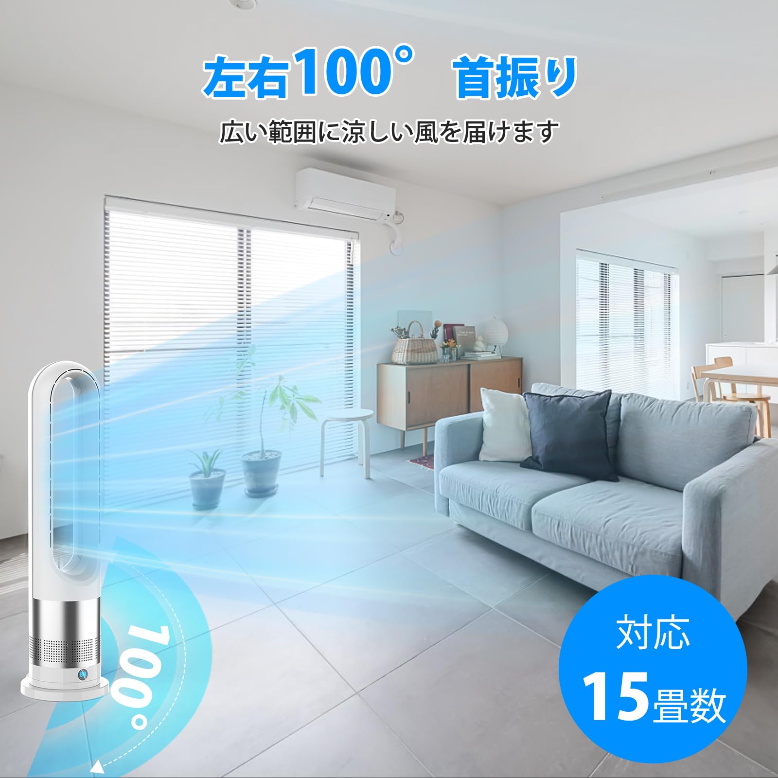 【自動100°首振りと静音運転、快適な空間を創造】羽根なしタワーファンは左右100°の自動首振り機能を搭載し、広範囲に風を届けます。洗濯物への送風や隣接部屋への空気循環にも活躍します。約30dBという静かな動作音は、睡眠や仕事に影響を与えず、羽根なし扇風機としての静音性能を追求します。サーキュレーターとしての機能も兼ね備え、室内の空気を常に新鮮に保ちます。自動首振りにより、本体を動かさずに部屋全体に涼しさを届けることが可能で、快適な生活空間を実現します。