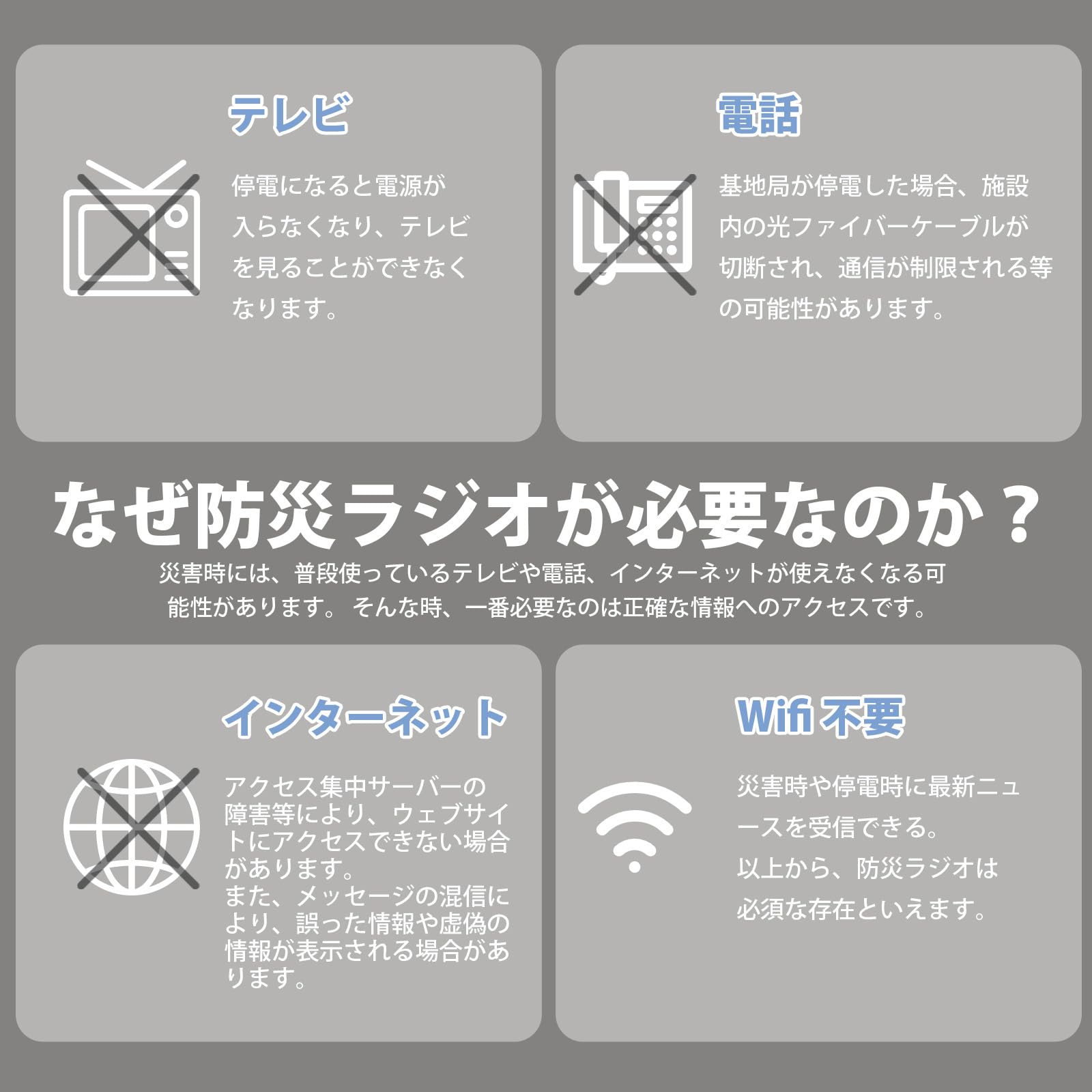 ?【FM / AM&高感度受信】AM(522-1620kHz)、FM(76-108MHz)の受信周波数に対応した防災ラジオです。普段は普通の家電として使用できる。緊急時には、台風、地震、津波などの貴重な最新情報を受信することができる。また、強化360度回転アンテナを搭載し、優れた受信感度を実現。アンテナを伸ばすことで、より電波の受信・調整がしやすくなります。電波の悪い場所でもしっかり受信できます。防災ラジオを防災セットに入れておけば、もう安心です。