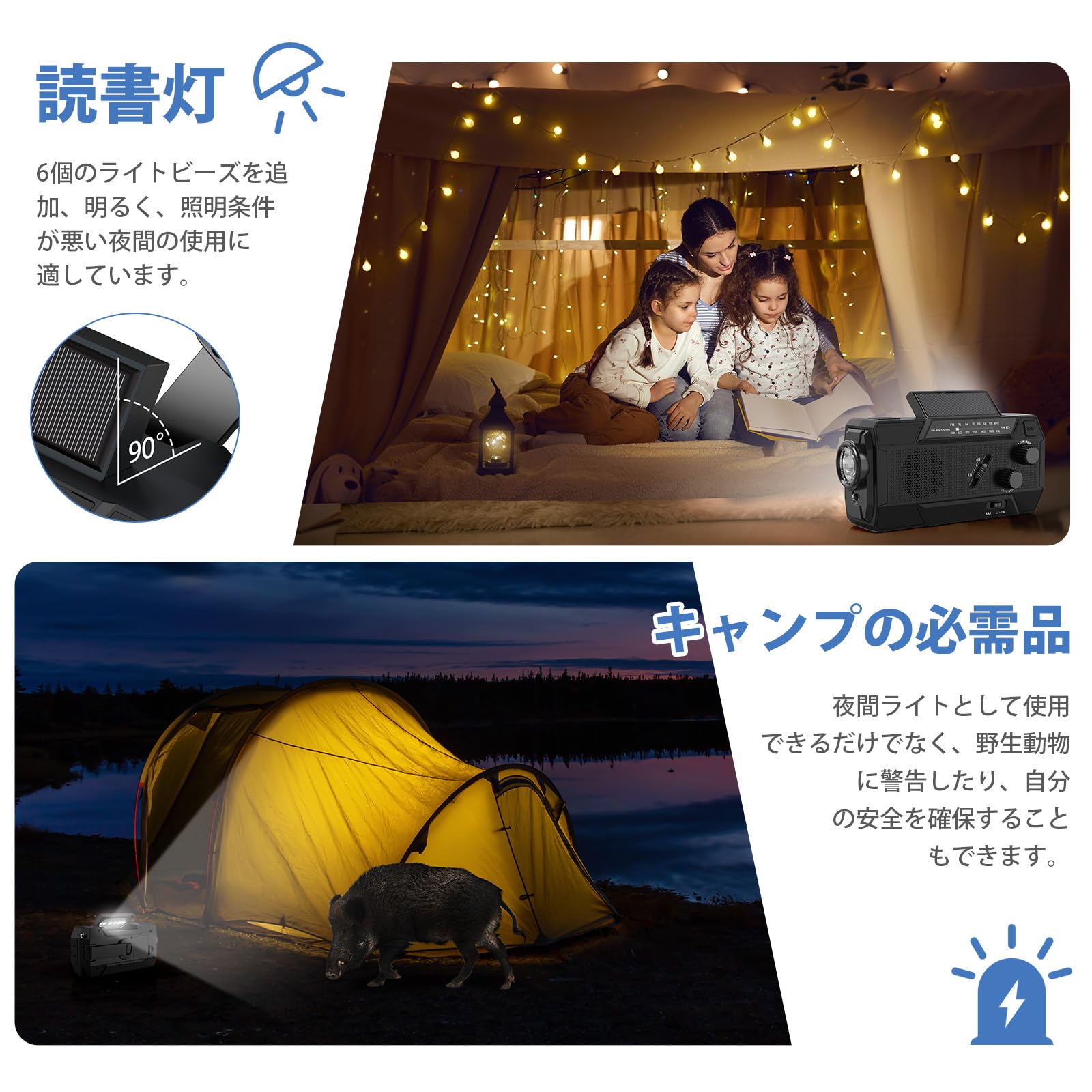 ?【LED懐中電灯&90°開閉読書灯】この多機能防災ラジオは、明るさを3段階に調節でき、懐中電灯としても使用できる。このラジオライトは10m先も問題なく照らせたため、夜道や停電の際に役立つといえます。読書灯が90°開閉可能で、夜の読書、夜間で車の修理、夜釣り、夜にランニング、キャンプなどの場合で作業に大活躍です。また、ナイトライトとしても使えます。