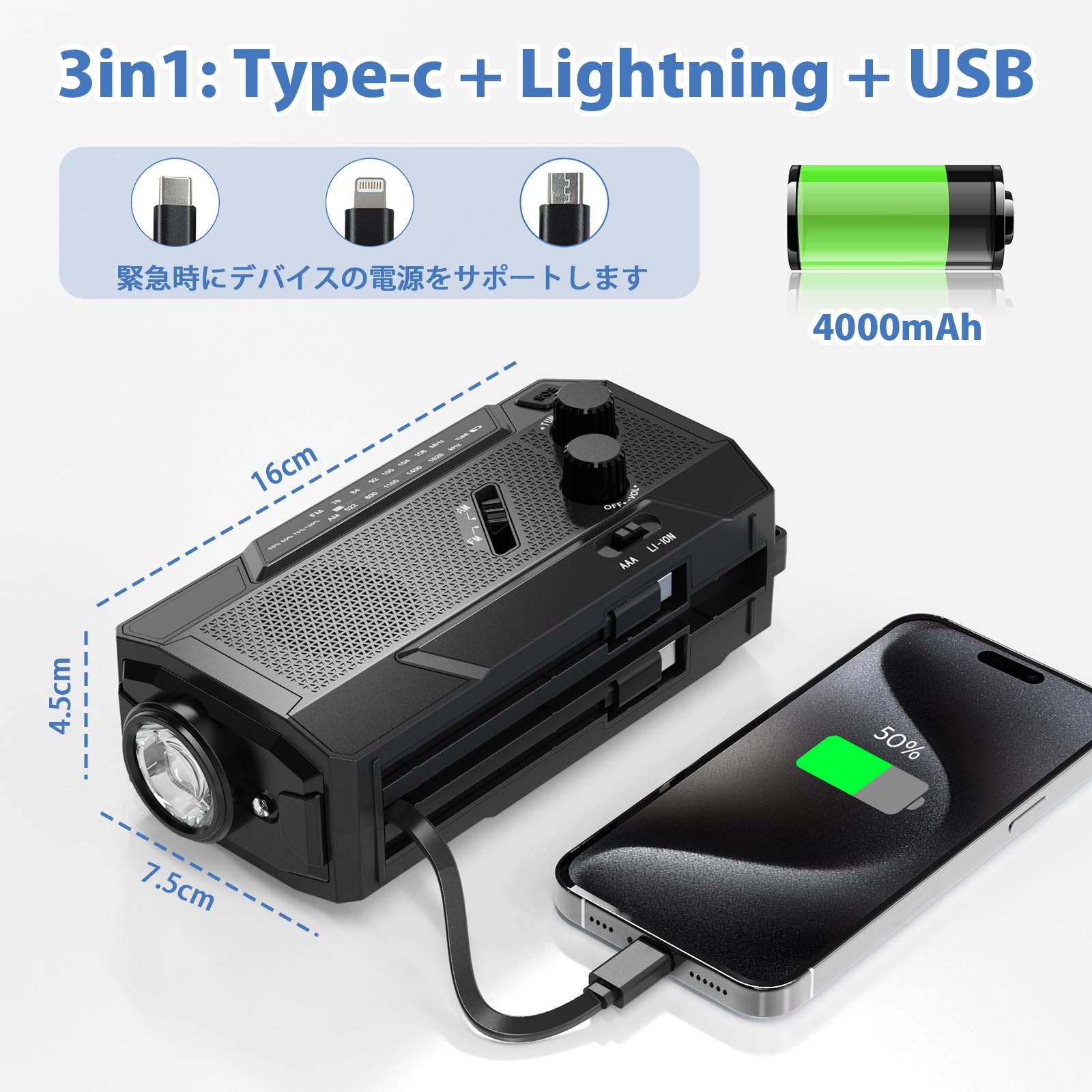 ?【4000mAh大容量&3ケーブル内蔵】内蔵の4000mAhバッテリーを搭載した防災ラジオです