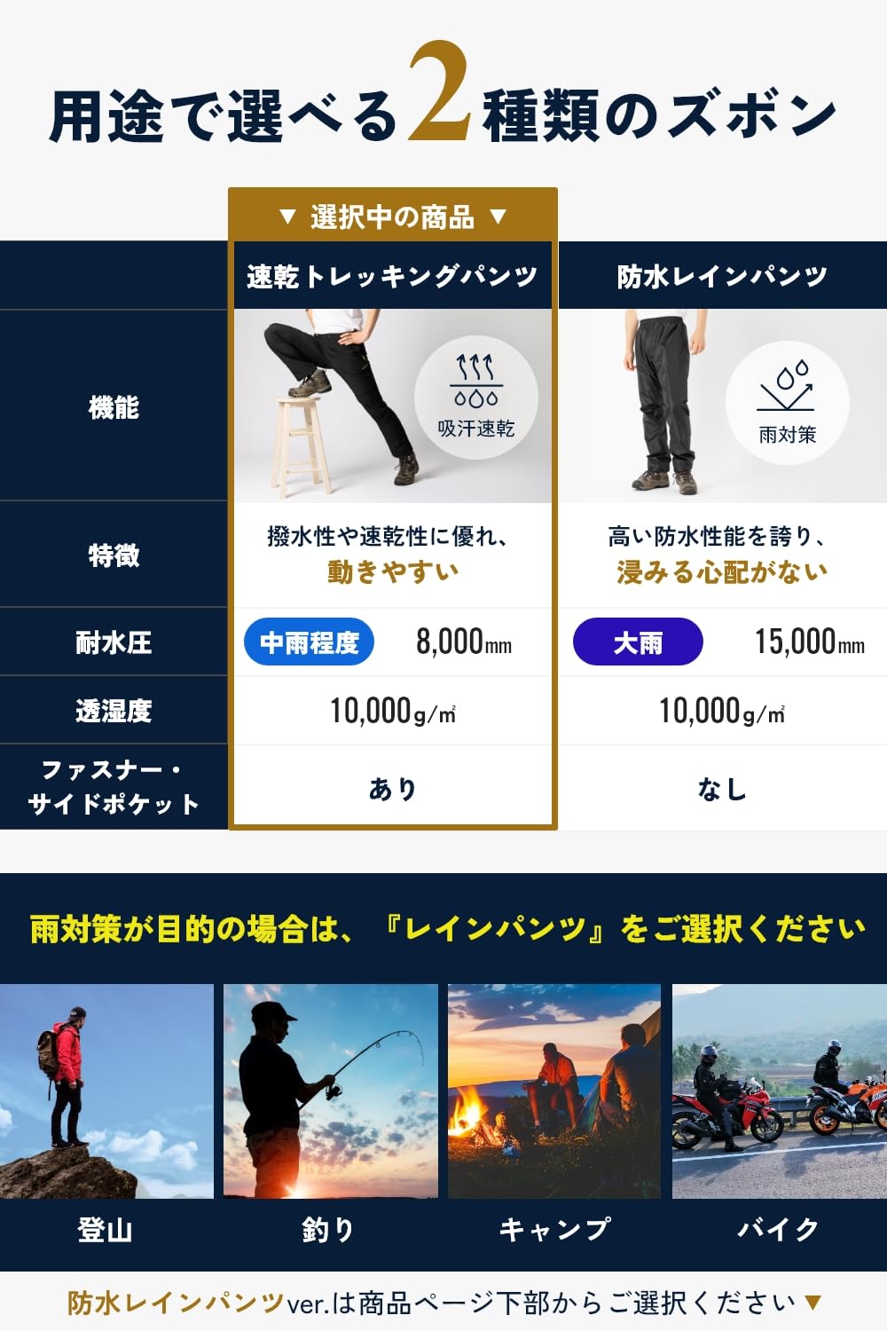 ?【選べる2種類のズボン】 用途に応じたズボンを2種類ご用意しました! ストレッチ性や履き心地を優先される方は「トレッキングパンツ」を、防水性能を優先される方は「レインパンツ」をご選択ください。現在閲覧中のページは「トレッキングパンツ」セットのページとなります。「レインパンツ」セットは本ページ下部からご選択頂けます。