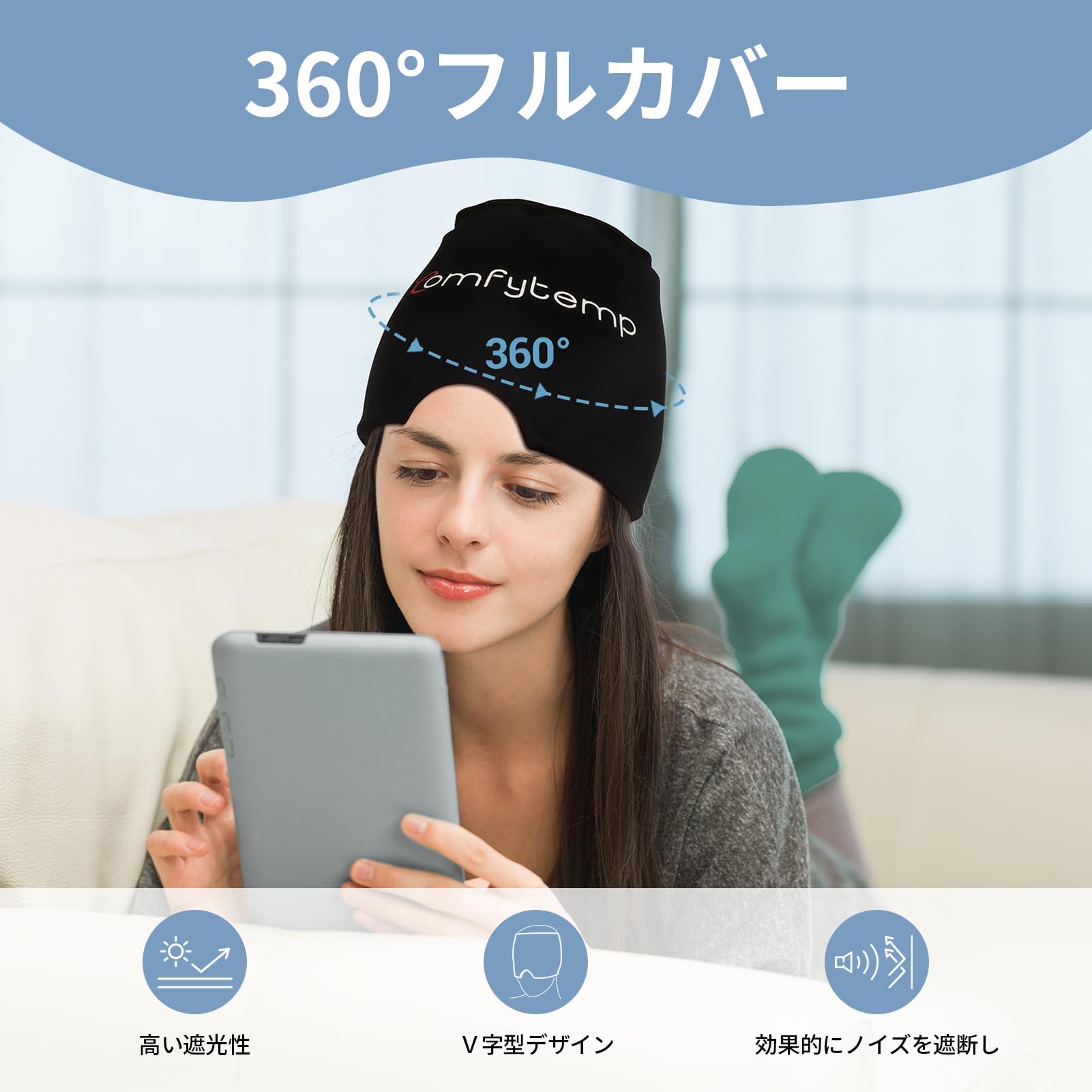 【360°フルカバー冷感キャップ】①Comfytemp冷感圧縮キャップは、全範囲の冷却体験を提供し、より早い回復のために効果的にターゲットとなる部分を狙います。②この着用可能なストレス解消するグッズは、ほとんどの人にフィットし、頭と目を簡単に覆うことができます。③冷却パッドは、呼吸を改善し、鼻の輪郭に合うV字型のデザインが特徴です。アイシングキャップとして、面倒なラップや不快なアイスパックに代わって頭/目元/顔をリラックスします。ご家族やご友人への贈り物としても最適です。