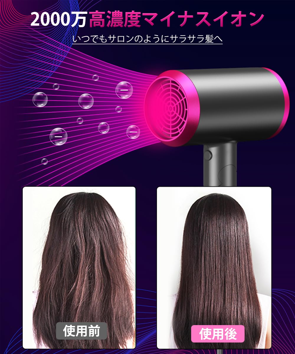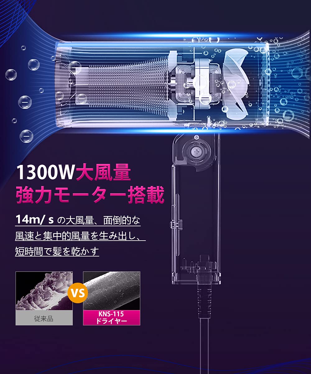 【1300W大風量・2種類のノズル付き】当店のヘアドライヤーは高品質の強力1300Wモータを採用し、高速で安定した気流を発生させ、髪にダメージを与えずに数分で根元から髪を乾燥させることができます。素早く長髪を乾かしたい方に最適なドライヤーです。2種類の専用ノズル付きで、ウェーブヘアやショートヘアなど用途に合わせてご使用できます。