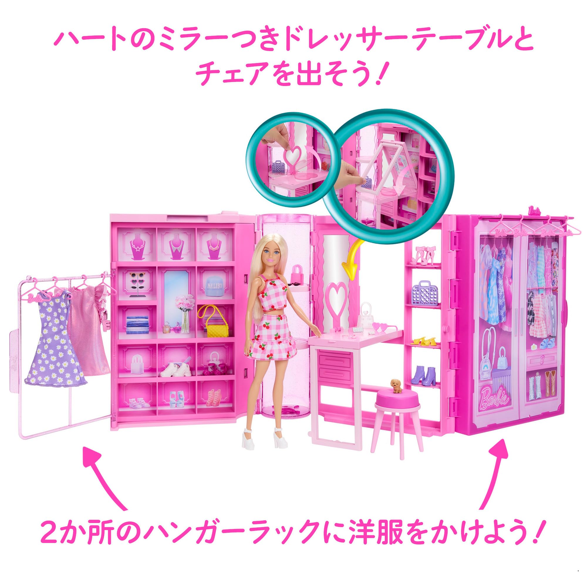 【内容】バービーのドリームクローゼットが登場!広げると約90cm大きく収納スペースも抜群!洋服、くつ、バッグ、アクセサリー、ハンガーなど27個の小物(ファッション含む)が付属しているので、洋服と小物を組み合わせて様々なコーディネートが楽しめます。20か所以上の収納エリアと2か所のワードローブがあり、お気に入りの洋服や、小物、アクセサリーを飾ることができます。また、クローゼットの真ん中はハート型のミラーつきのテーブルドレッサーがついていて、ごっこ遊びも可能。コンパクトに折りたためるので、持ち運びやお片付けに便利!