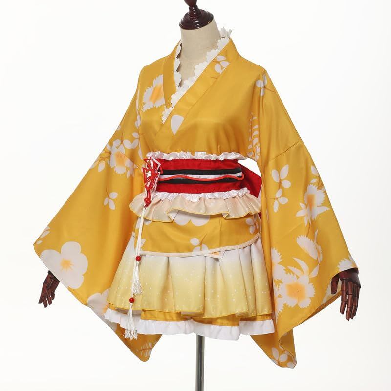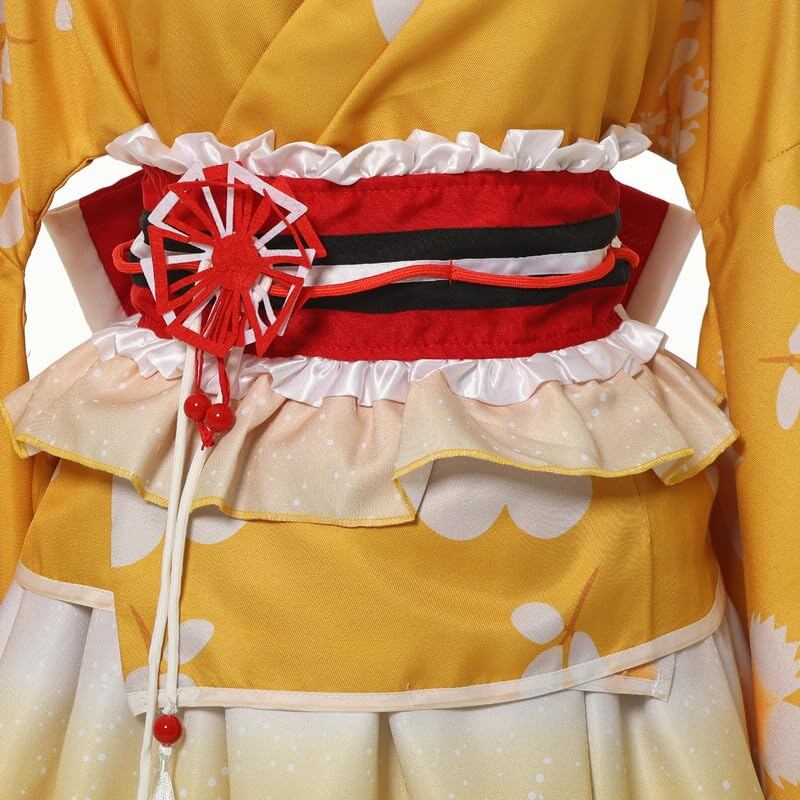 日本の女性の伝統的な着物のコスプレ衣装で、幅の広いウエストバンドとスカートがあり、バンドには花の形をしたピンが付いています.