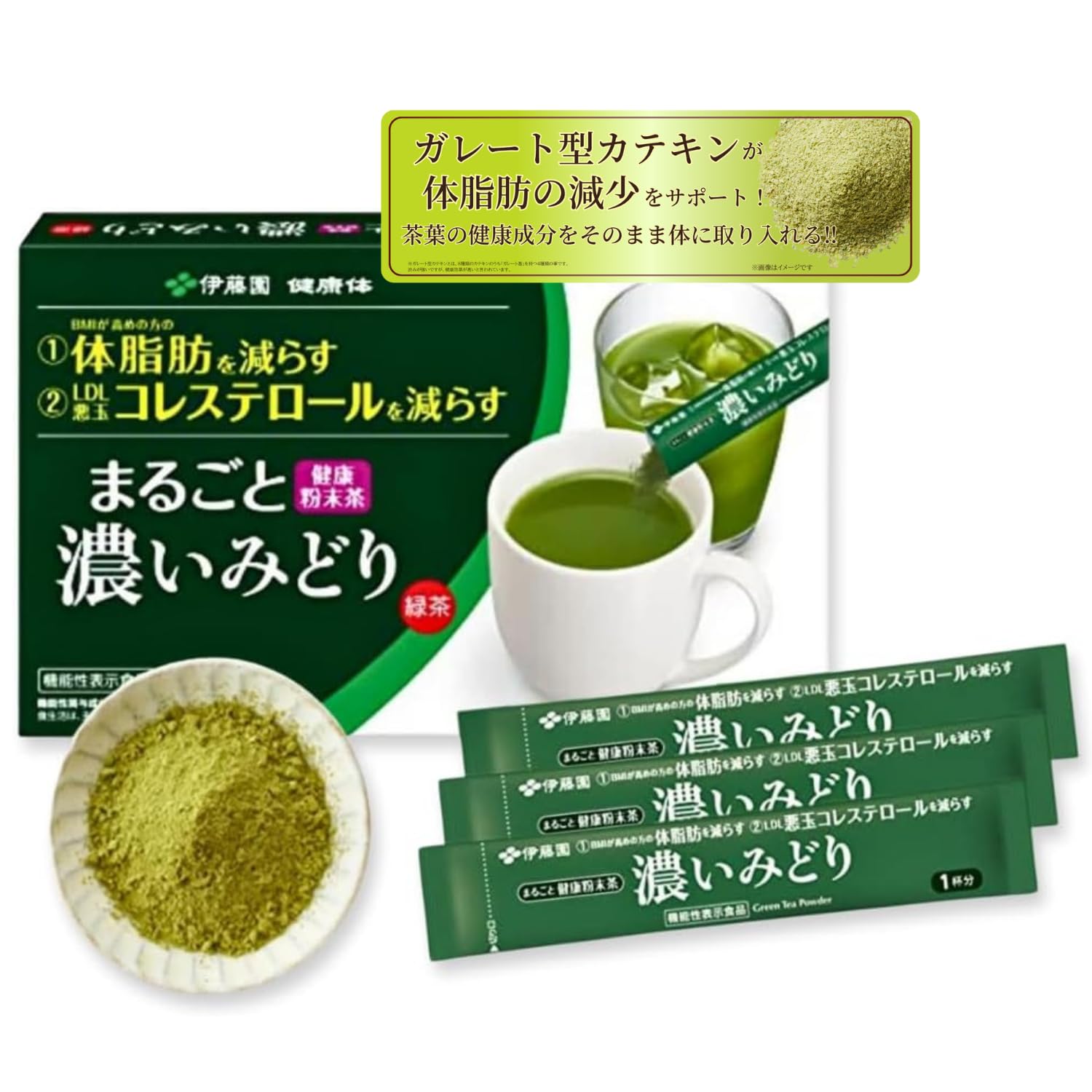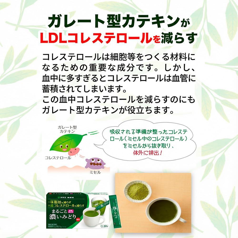 「体脂肪・コレステロールが気になる方に!」。緑茶をまるごと粉砕した、粉末緑茶(スティックタイプ)です。 「体脂肪を減らす」「LDLコレステロールを減らす」機能があることが報告されている機能性関与成分ガレート型カテキンを含む、機能性表示食品(トクホ)です。
