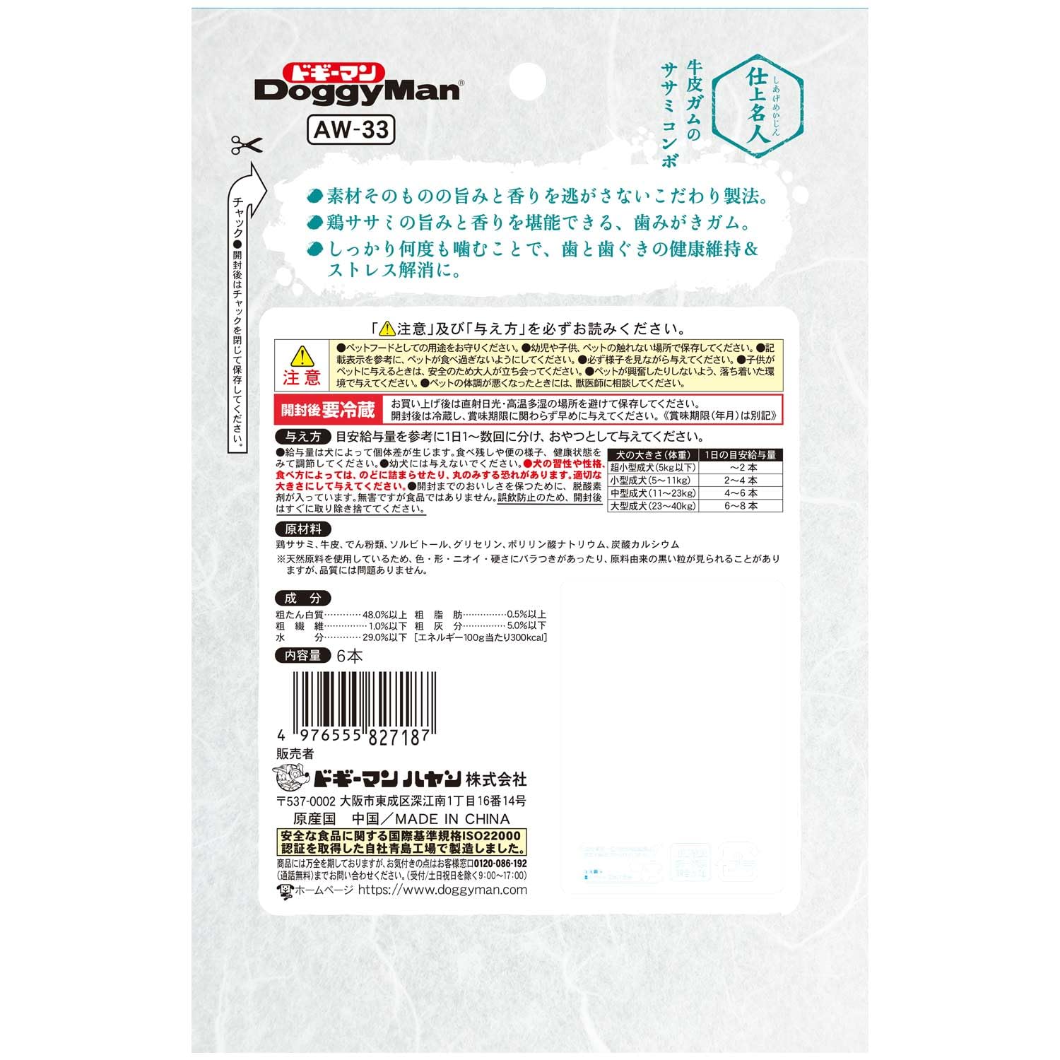 ●牛皮の棒ガムの先端にササミを手巻きしたササミ巻きガム。●手に持ってかじらせやすいスタイルで鶏ささみのおいしさを堪能できる。●牛皮ガムをしっかりかじることで歯垢をこすり取るデンタルケアにも。●牛皮にササミの香りが残り、しっかり何度も噛むことで歯と歯ぐきの健康維持とストレス解消に。●保存料、着色料、発色剤、酸化防止剤を使用しない無添加良品品質の仕上名人シリーズ。