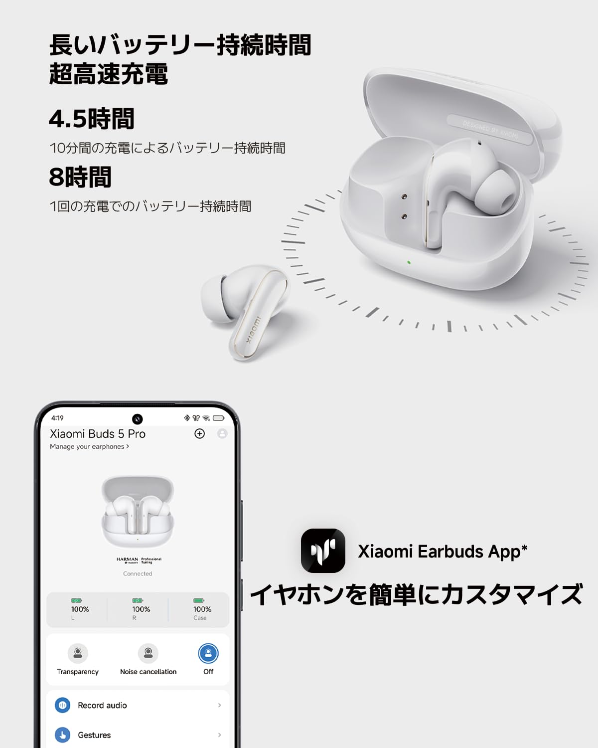 ?録音、撮影、AI翻訳などの機能をクイックに:耳に装着したままでもケースに入れていても最大4時間のボイスレコーディングをすることができます。接続したXiaomiスマートフォンのシャッターをイヤホン本体から操作することや、ボイスアシスタントの起動も可能です。また、20の言語のAI翻訳と文字起こしができ、電話での打ち合わせ時の議事録作成などで活躍します。(AI翻訳と音声文字起こし機能は、OTAしてからXiaomi 15 Ultraで利用できます。今後、さらに多くのモデルに対応する予定です。)