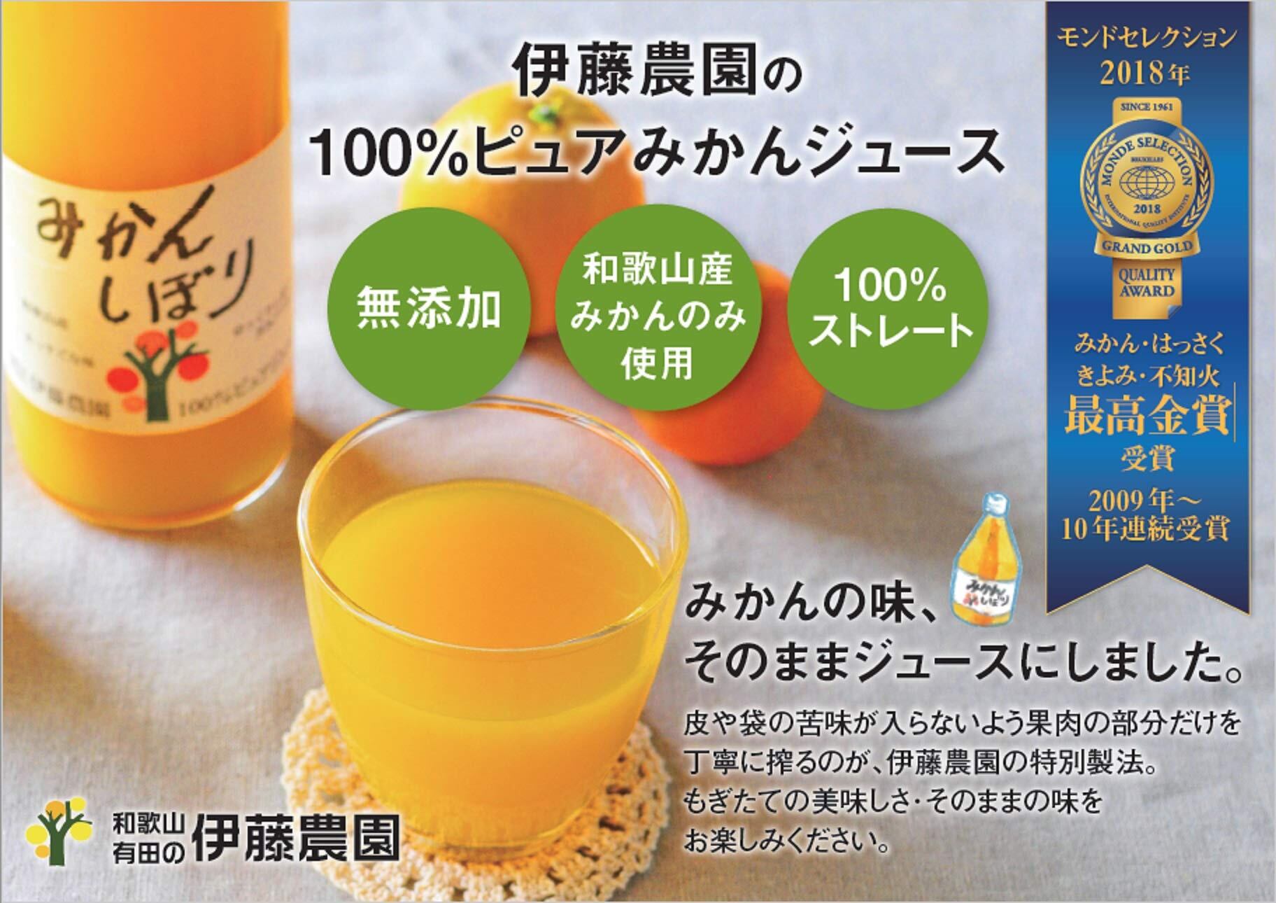みかん・きよみはそれぞれモンドセレクション最高金賞受賞。、甘い種類からさっぱりした種類まで飲み比べ頂けるこだわりのジュースセットです。