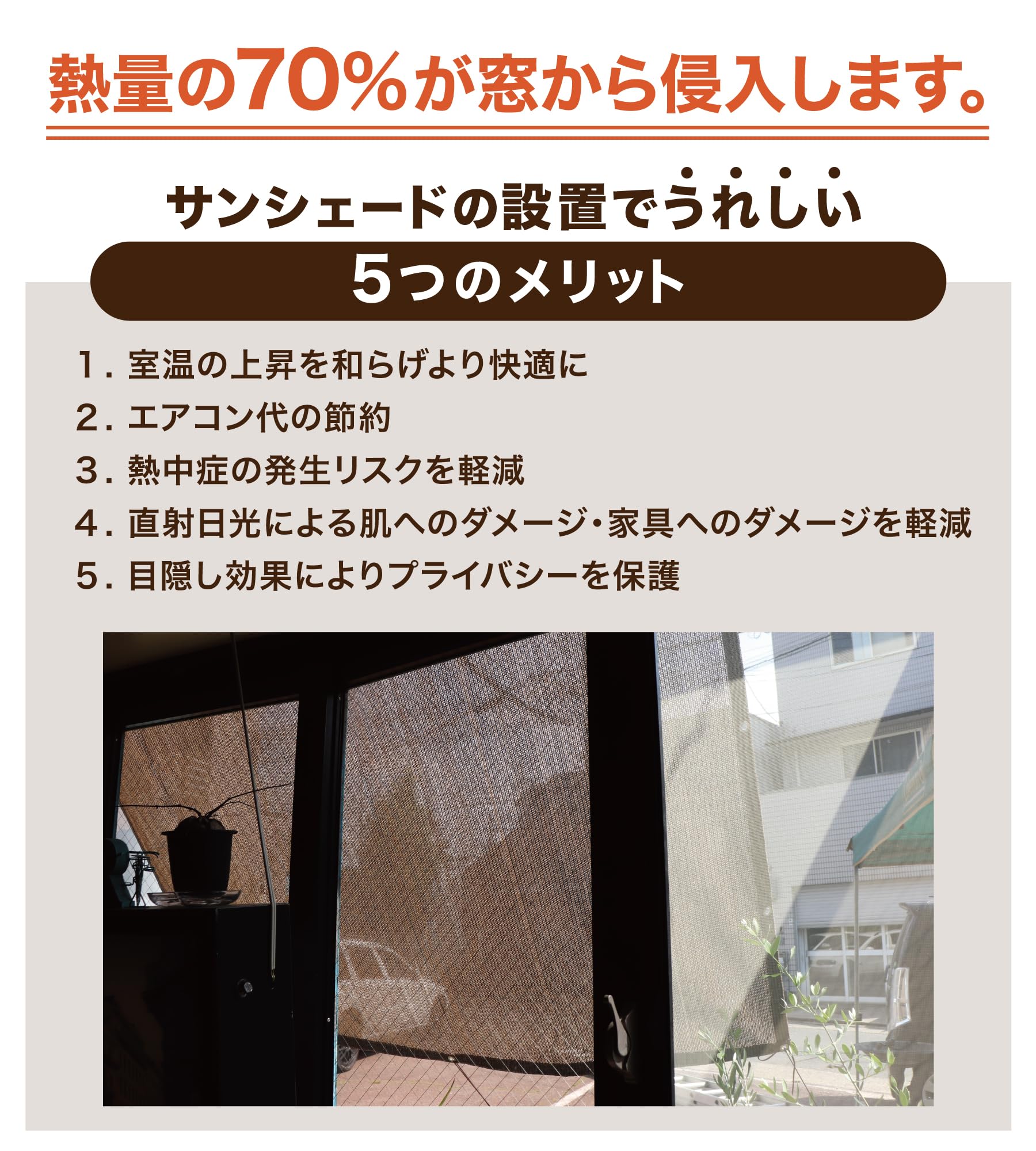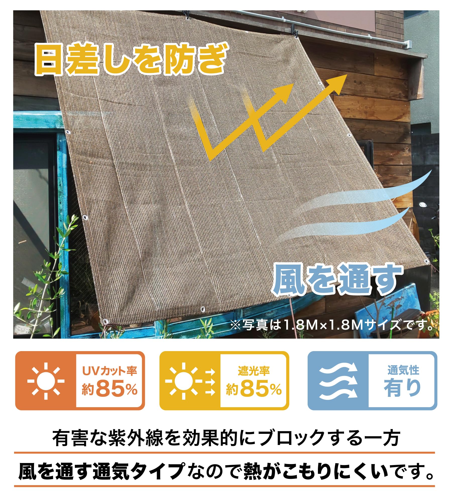 風を通す通気タイプの為、熱もこもりにくく、明りも適度に取るので室内も暗くなり過ぎません。ベランダ、玄関での使用はもちろん、キャンプ、BBQ等アウトドア時の日除けとしても大活躍します。