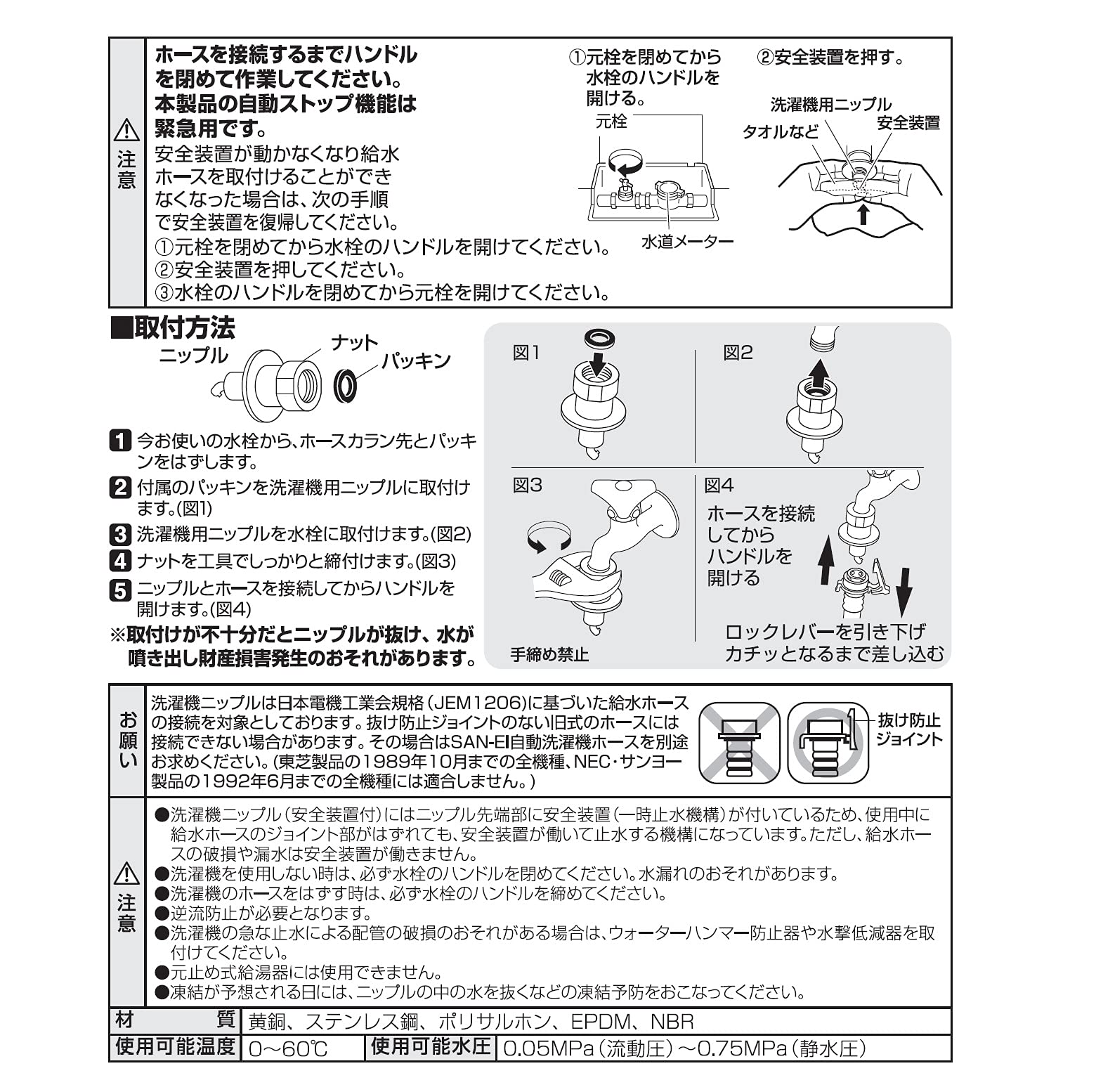 【注意】各洗濯機元口、洗濯機用ニップルを混合栓に使用される場合には、逆流を防ぐため、逆流防止弁付の器具あるいは湯または水のみでご使用ください。