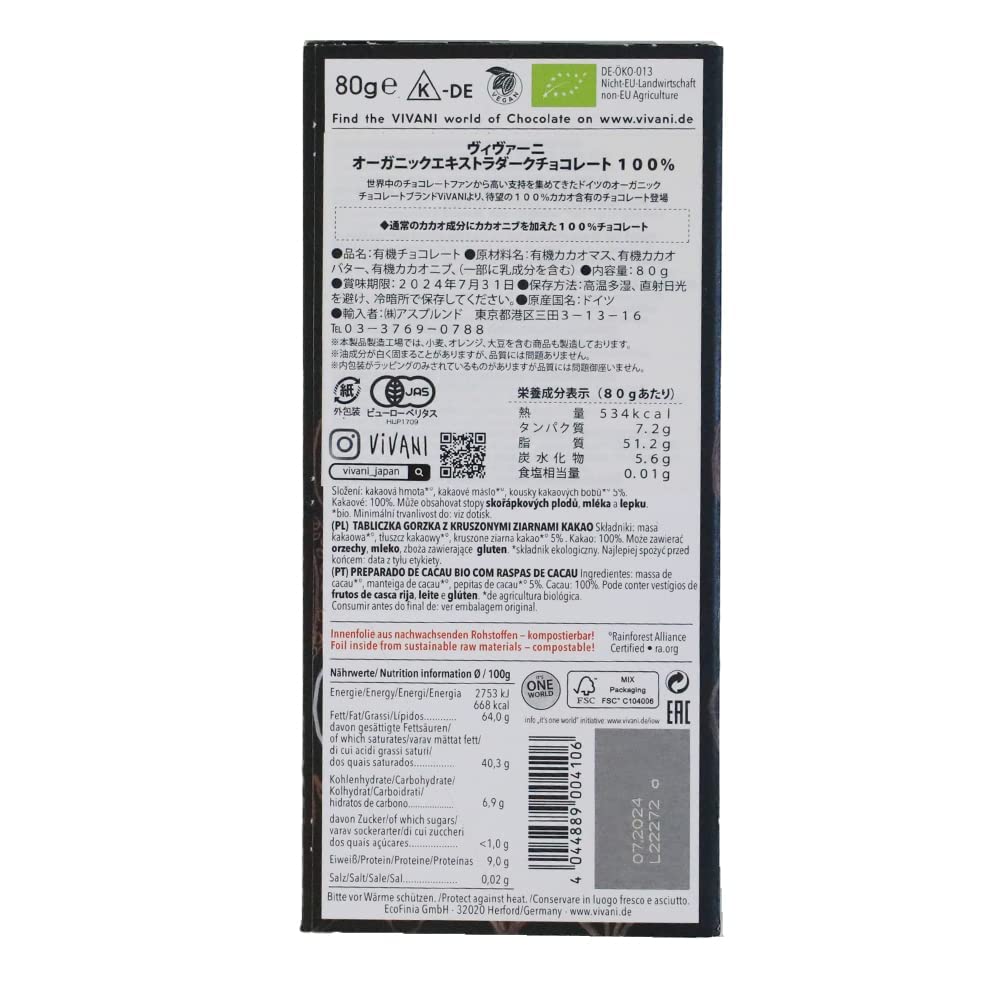 ヴィヴァーニ(Vivani)オーガニックエキストラダークチョコレート 100%+カカオニブ 80g