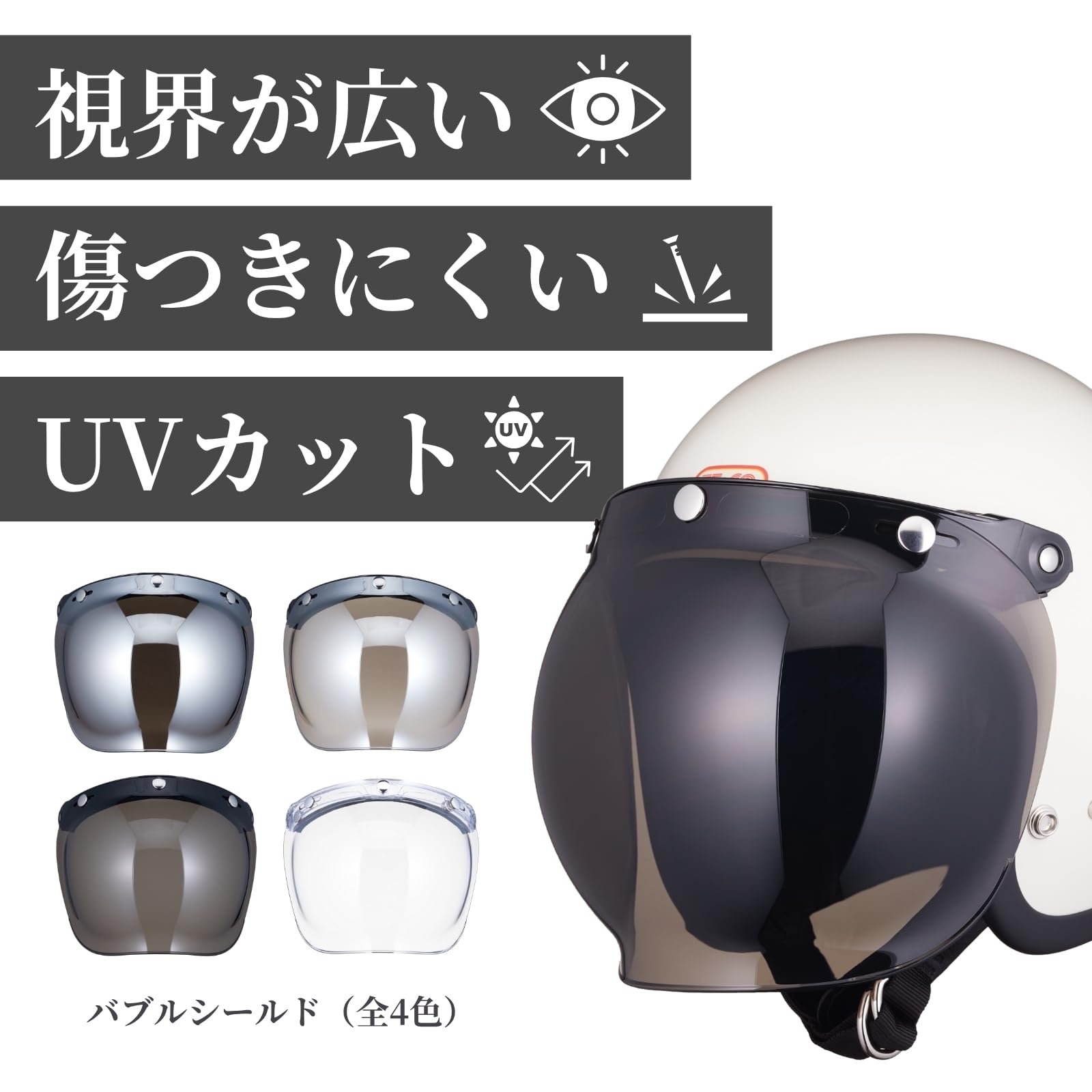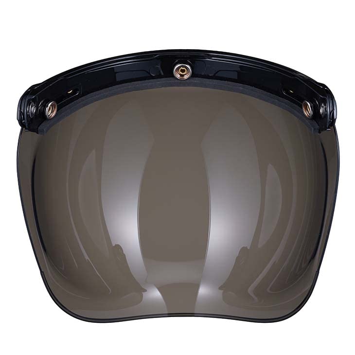 バブルシールド ライトスモーク 昔ながらの球体デザインですが、ひずみは少なく視界性はとても良いです。 レンズは ・UVカット ・傷つきにくいアンチスクラッチ の各表面処理済み。