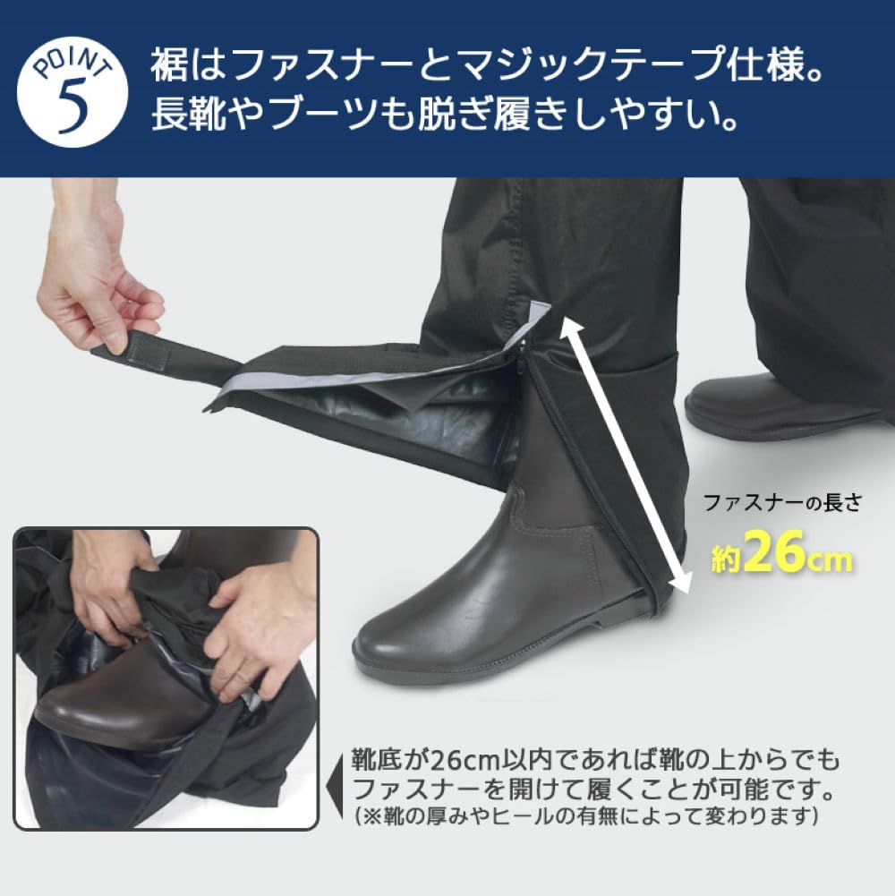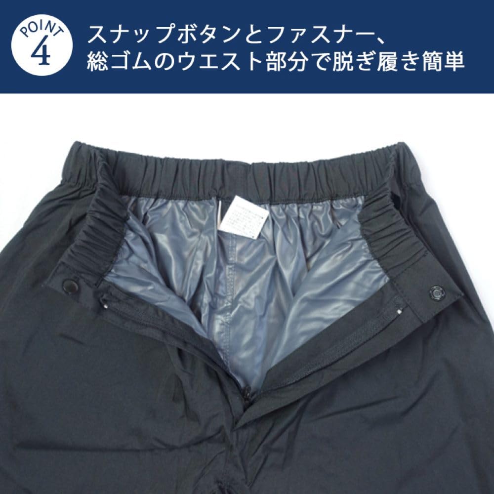 裾ファスナー付きの透湿・防水 ストレッチ レインパンツに、ポケットと反射帯、ベルトループがついてリニューアルしました! ストレッチが効いているので動きやすく、右後ろにファスナー付きのポケットがあるので、ちょっとした小物や鍵などを入れるのに便利です。 表面は撥水加工で水をはじき、裏面はTPUラミネートとシームテープ加工で防水性UP! 透湿性がある生地なので、ムレを軽減し内部のベタつきを抑えて快適な着心地です。 裾はファスナーで開閉できるので、ブーツや運動靴が脱ぎ履きしやすい。 裾幅はマジックテープで調節可能。絞るとさらに裾からの雨の侵入をふせぎます。 裾ファスナーとマジックテープ部分には反射帯がついており、車などのライトに反射して光るので夜間や薄暗い雨の日でも安心安全です。 マットな上品な質感で、老若男女問わずご使用いただけます。