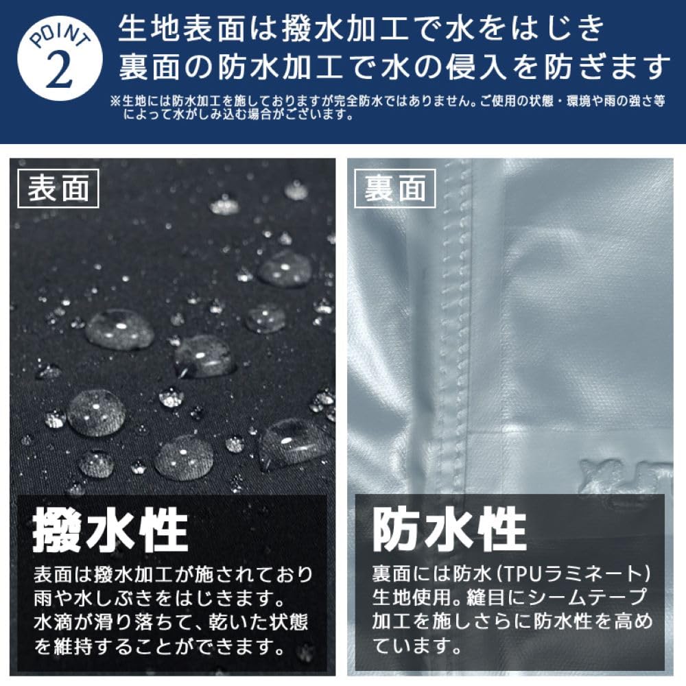 【透湿防水素材】独自の透湿防水素材AETX-TECHは、レインパンツに必要な透湿防水性とドライで快適な気心地を実現します。(2層構造・・・ポリエステル地にポリウレタンのコーティング(吹き付け)・ラミネート(貼り付け)を施す事により快適性をアップさせ、雨風は通さずに発汗によるムレを防止します。)