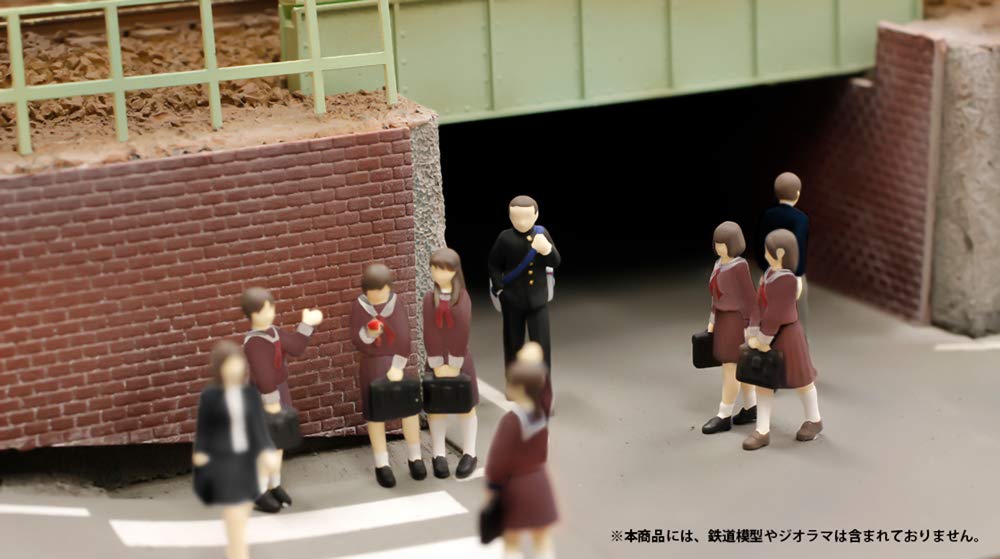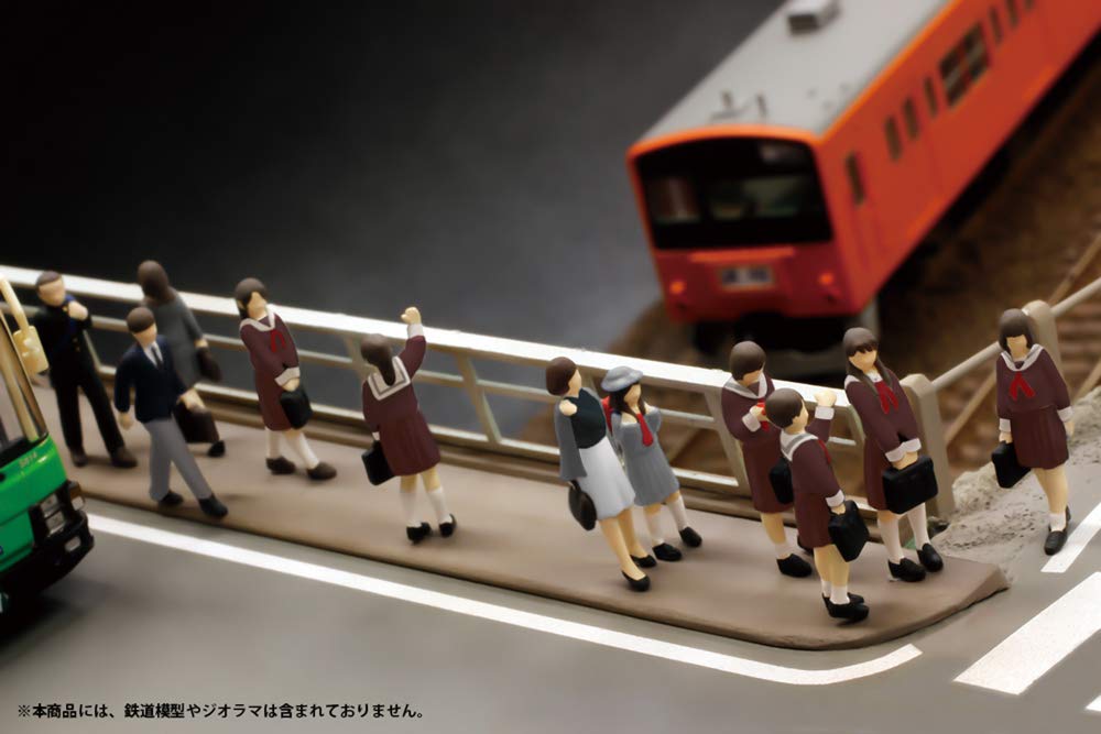 内容は、つり革つかまり立ち・ジェスチャー立ち・携帯いじり立ち・着席読書・鞄両手持ち立ちの5体で、スカートのプリーツや鞄もしっかり造形しています。