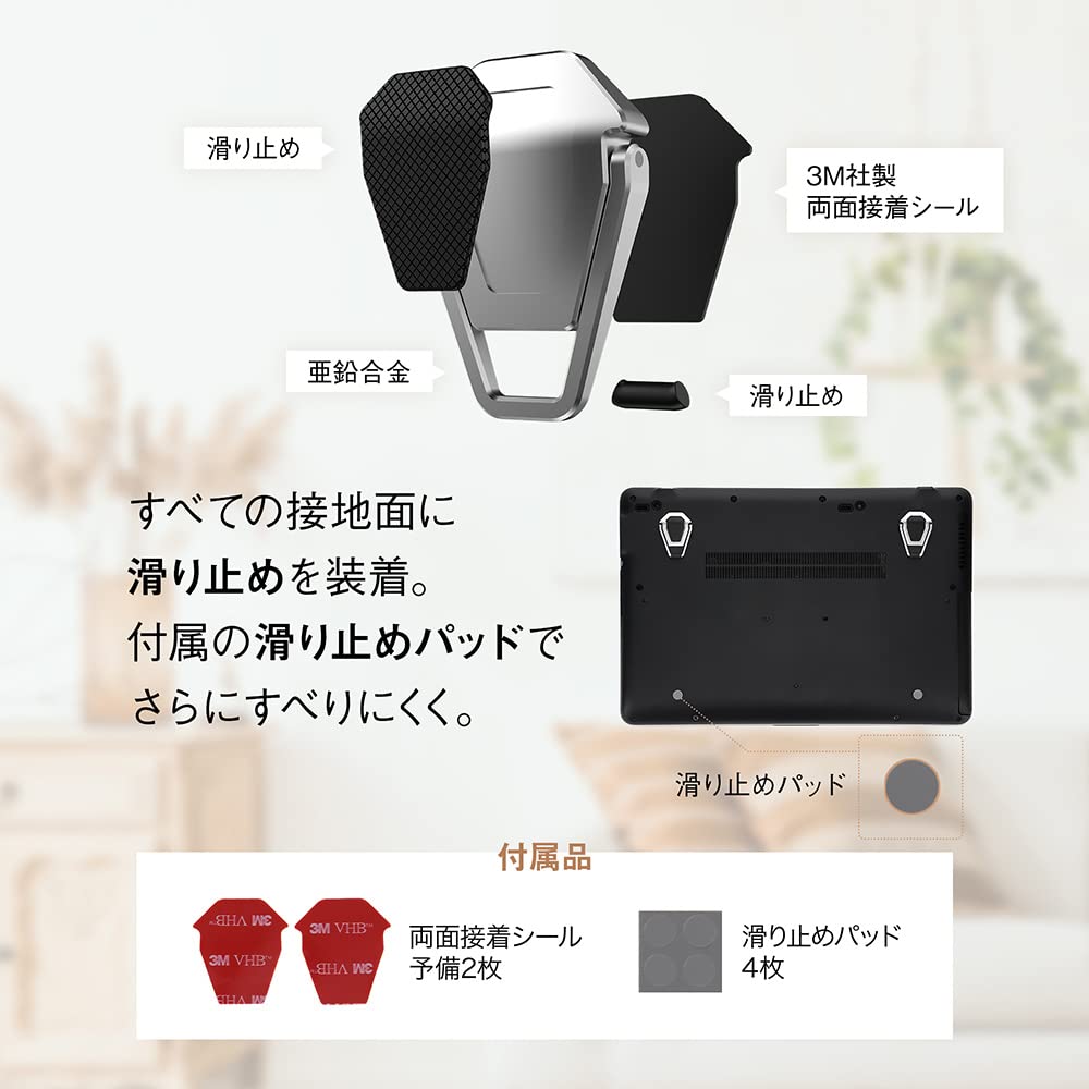 ノートパソコンの裏面に貼り付けるだけのコンパクトなスタンド:ノートパソコンの裏面に貼り付けるだけで、タイピングや操作をしやすい角度にセッティングすることができるコンパクトなスタンドです。