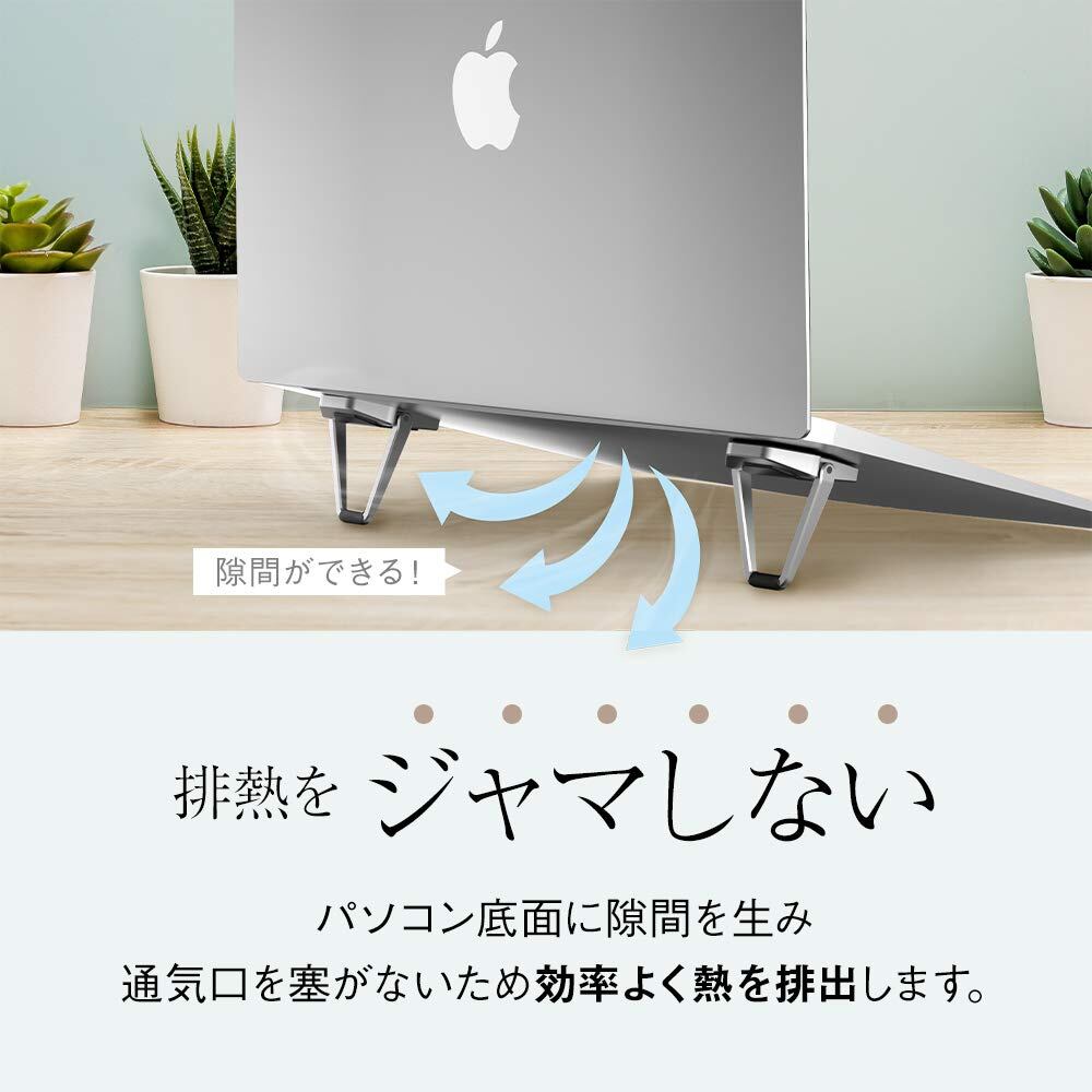 コンパクトだから排熱の邪魔にならない:ノートパソコンの下部に適度な隙間が空くことで、排熱の通気口を塞ぐことなくノートパソコンなどから出る熱を効率よく排出することが可能です。
