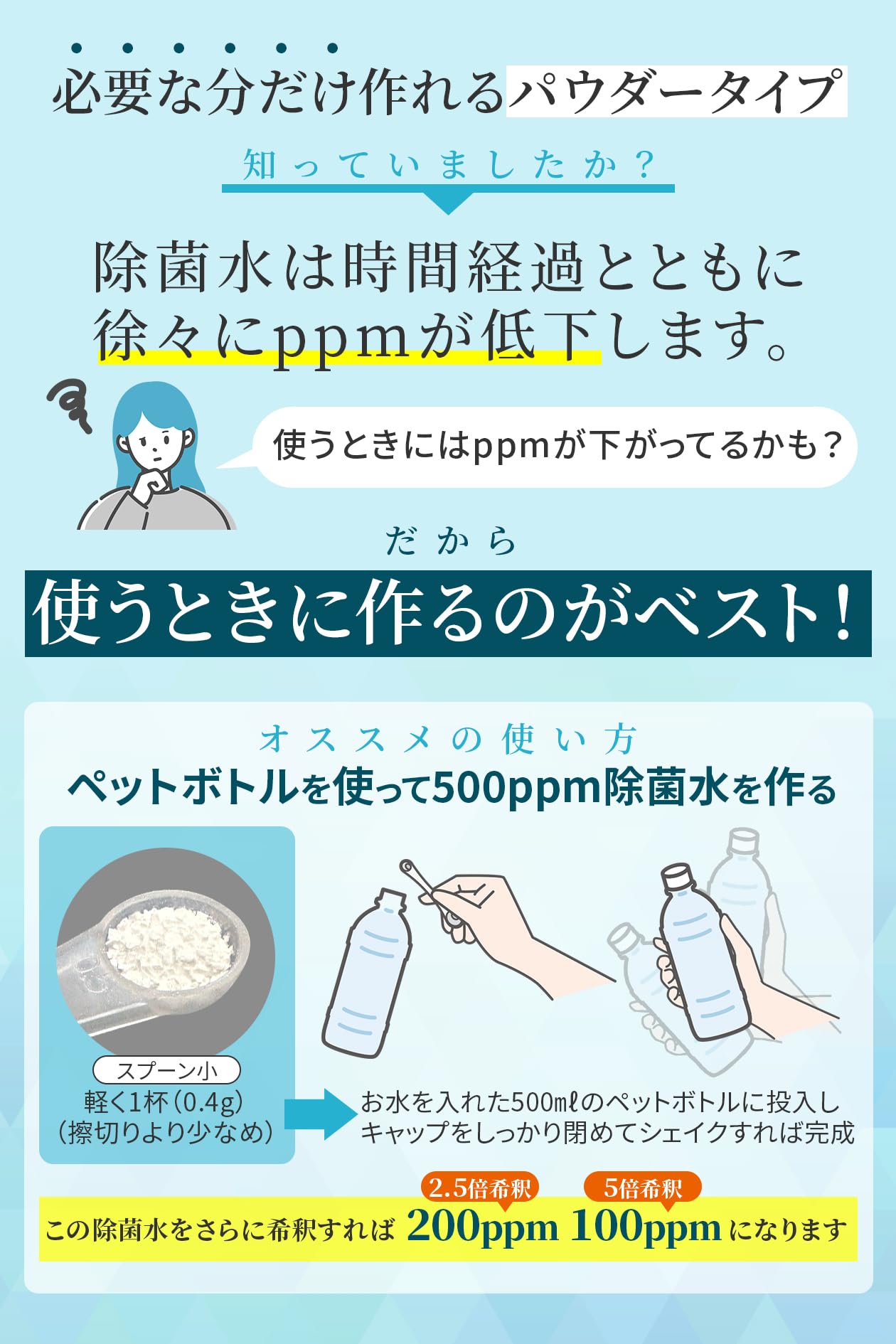 【メリットたくさん】長期保存(3年)でも品質の低下はほとんどありませんし、使うタイミングで生成できるので、液体タイプと違って「使うときには濃度(ppm)が下がっているかも」といった心配もありません。