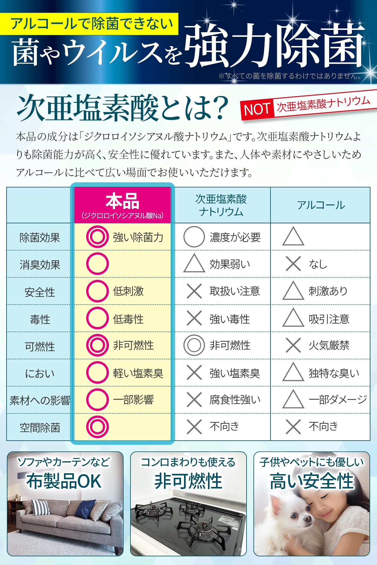 【希釈で様々な用途で活躍】嘔吐物などには500ppmで、加湿器除菌や空間除菌、身の回りの除菌、ゴミのニオイ対策やトイレの消臭など日常向けには2倍〜10倍まで希釈してお使いいただけます。夏はプールの除菌としてもおすすめです。※本製品は主成分に「ジクロロイソシアヌル酸ナトリウム」を使用しており、漂白剤として使われる「次亜塩素酸ナトリウム」とは異なる成分です。水に溶かすことで除菌・消臭に使用される「次亜塩素酸水」を生成するため、クリーナー剤のような“汚れ落とし”用途ではなく、衛生管理目的でご使用いただけます。