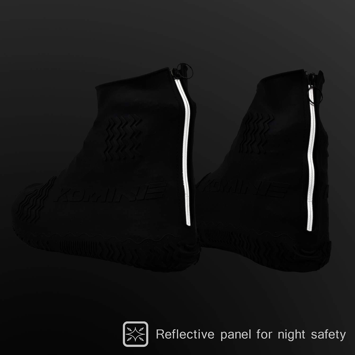 優れた伸縮性でぴったりフィットのシリコン製レインブーツカバー。バックジッパー付きで着脱簡単。シフトペダルの当たる甲とくるぶしに補強を、雨天時のグリップを考慮したソールパターンを採用したライディングに適した設計。バックジッパー部には夜間被視認性を高めるリフレクターをプリント。