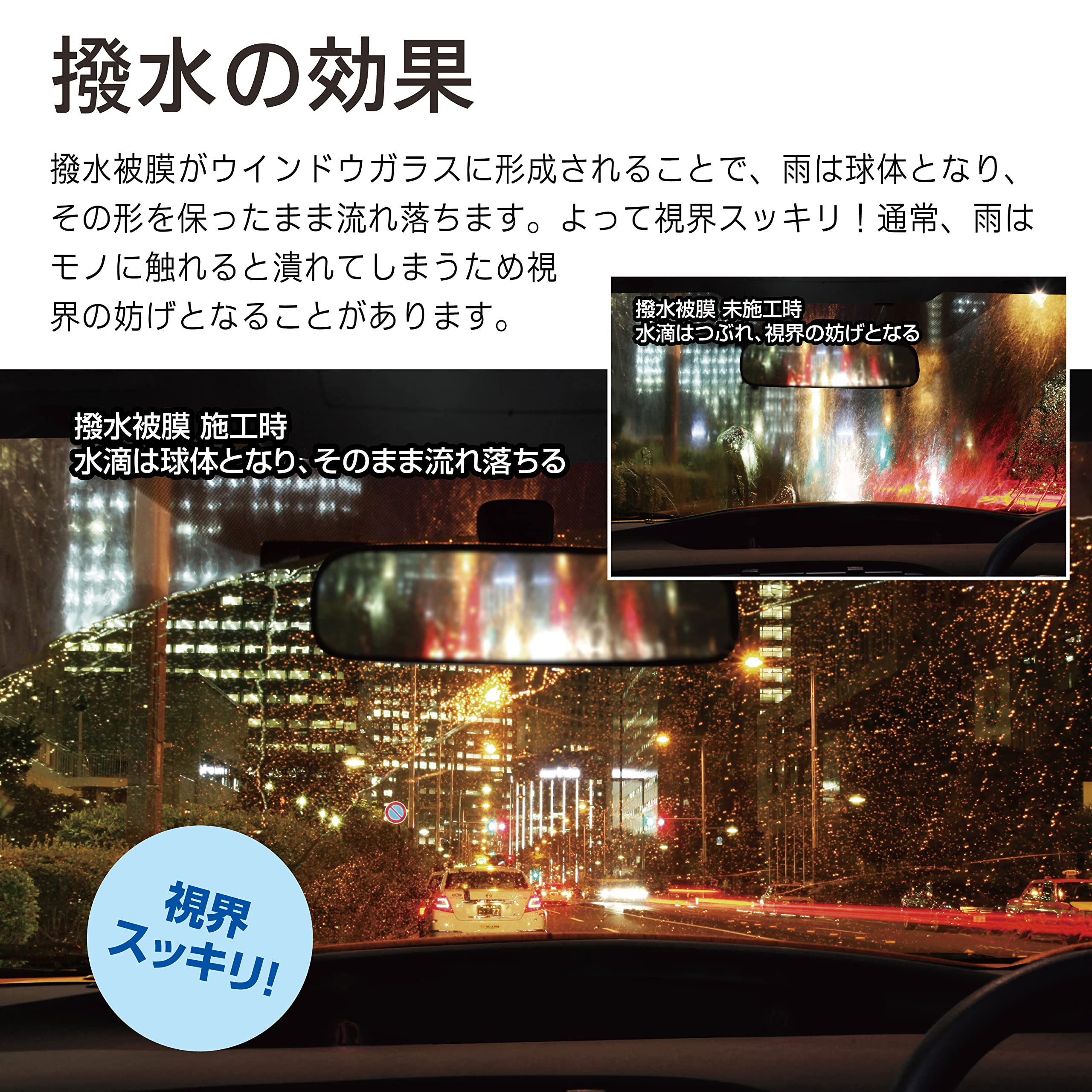 撥水効果は使い続ける事で撥水被膜を再度成型するので、安全な視界を確保出来ます。