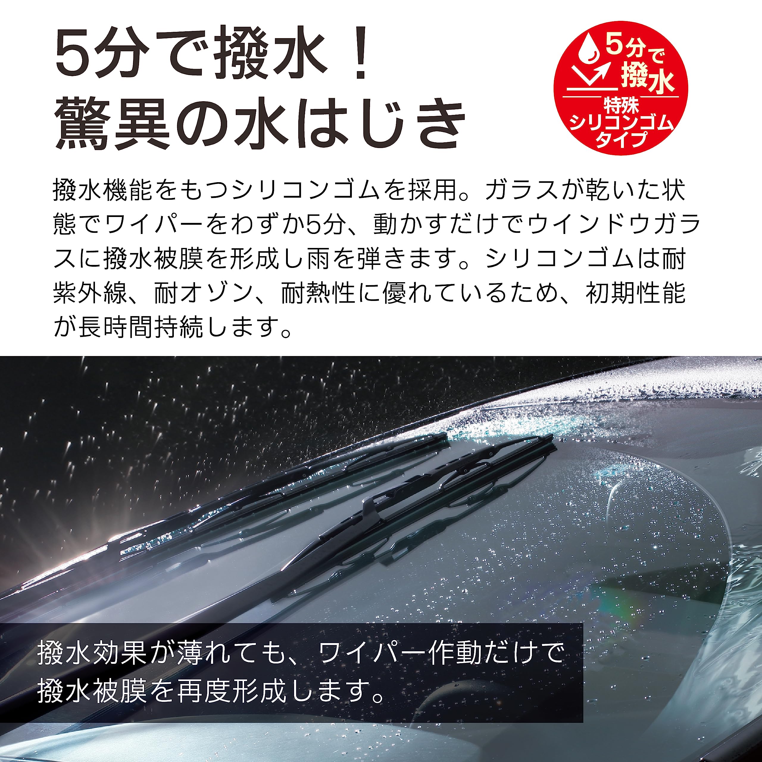 【超撥水】わずか5分作動させるだけで雨を弾く、超強力シリコートワイパー用替えゴム。