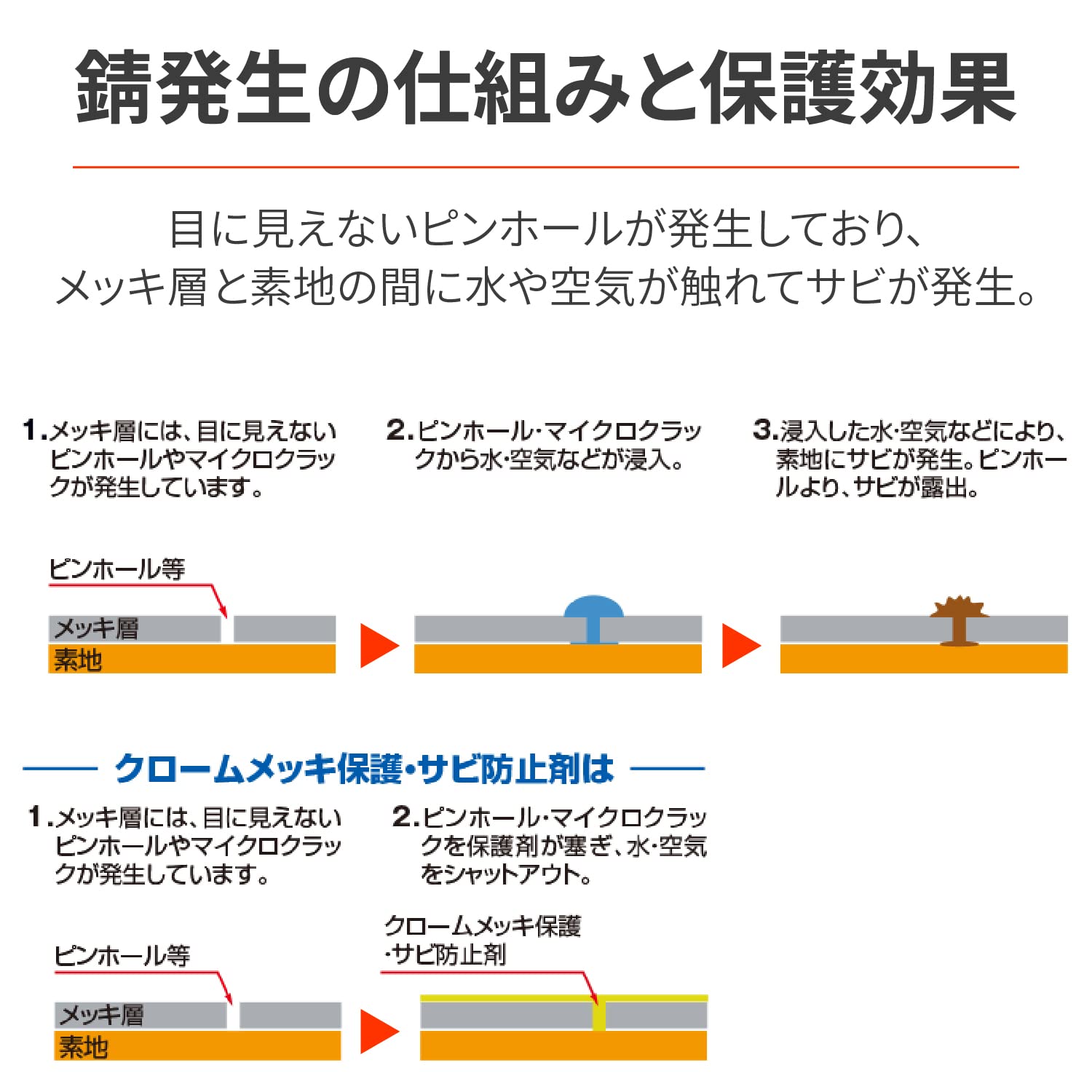 ●画像はイメージです。<br>●製品仕様を十分ご確認のうえ、使用方法を守り正しくお使いください。<br>●金属面のクロームメッキ部以外(樹脂メッキなど)は使用できません。<br>●塗布面をコンパウンドで磨くと保護防錆効果が落ちます。<br>●あやまってクロームメッキ以外の物に付着した場合は、すみやかにふき取ってください。表面を変色・変質・溶解させる恐れがあります。<br>●120℃以上になるマフラーには使用できません。