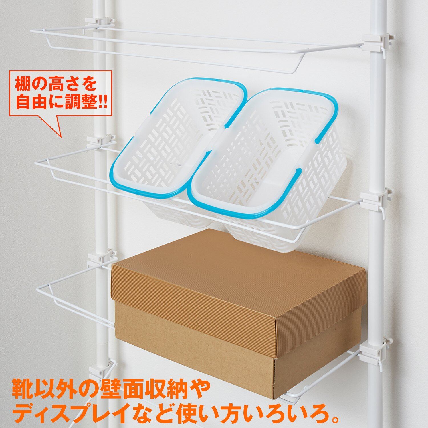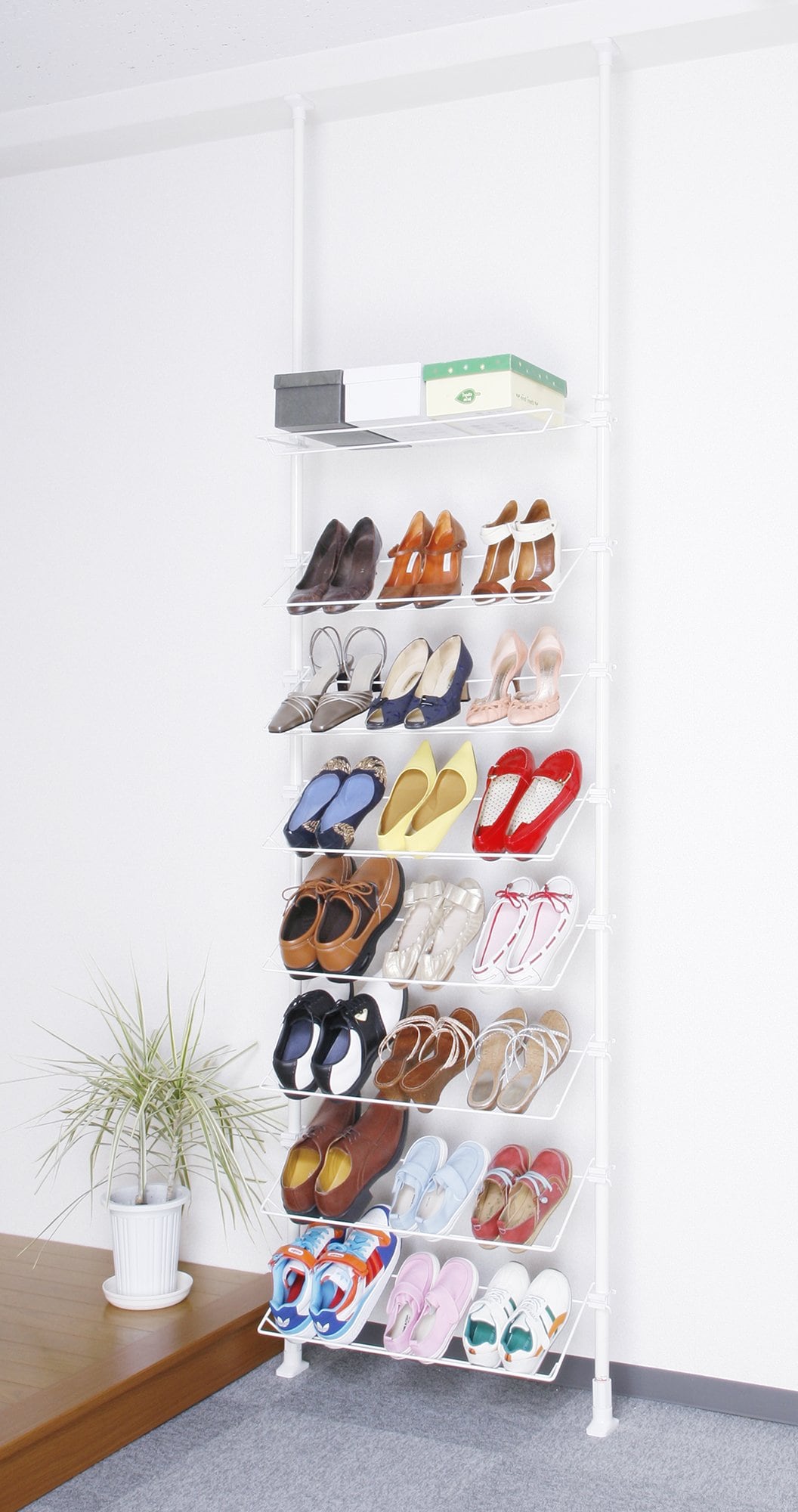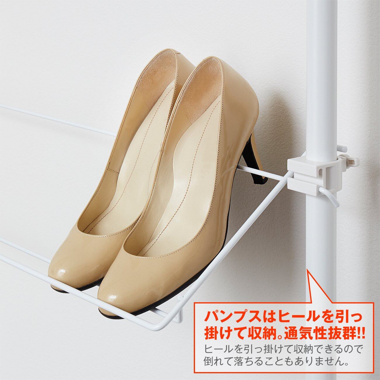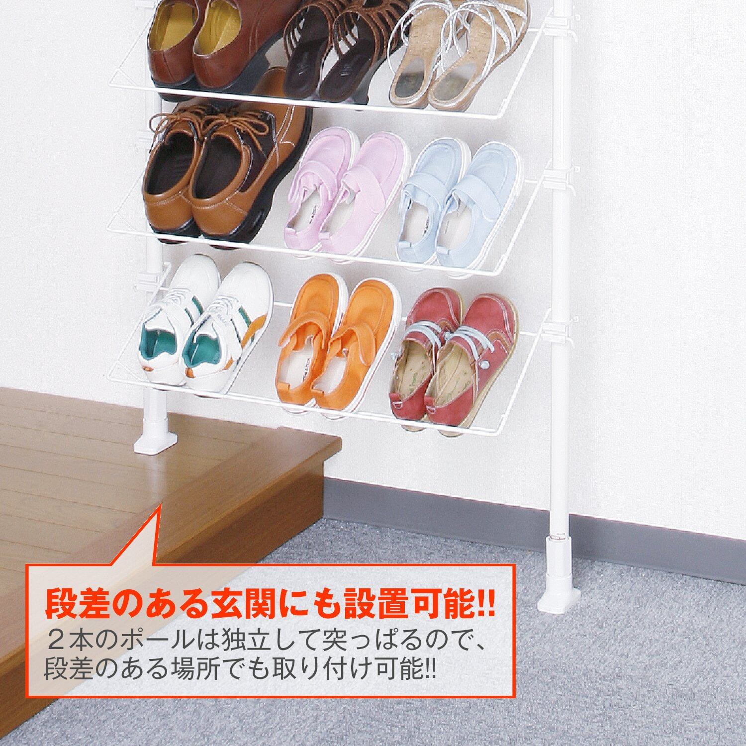工具不要、つっぱるだけで設置できるシューズラック。棚は水平置き・斜め置きが選べ、高さも自由に調節可能。
