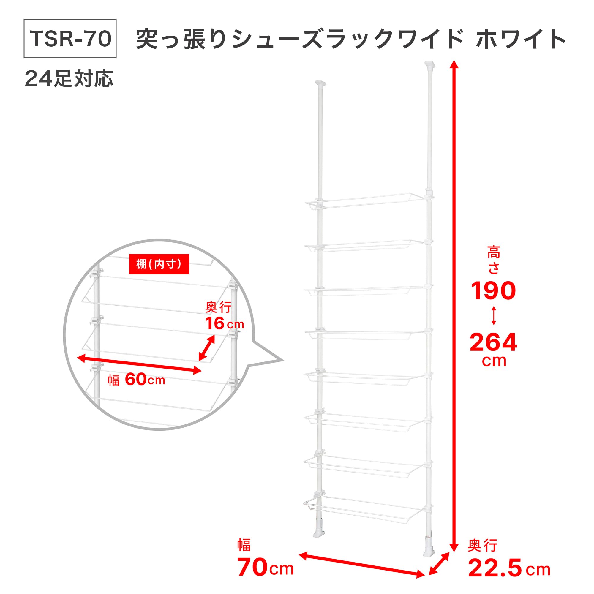 【人気】HEIAN SHINDO つっぱりシューズラック 24足対応 ワイヤー1本脚タイプ ホワイト 8段 取付幅70cm 取付高190~264cm TSR-70 平安伸銅工業