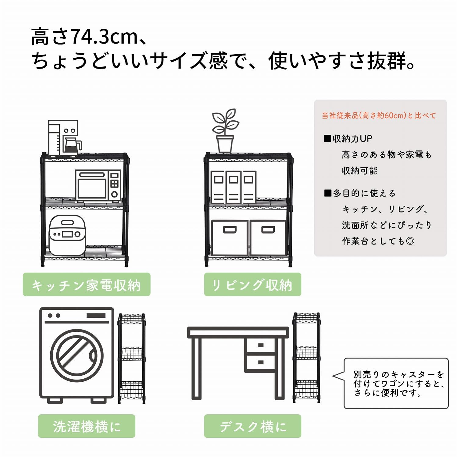 ●スチールラックはキッチン収納としてはもちろん、リビングや子ども部屋、押入れ収納などにも高い収納力を発揮します。