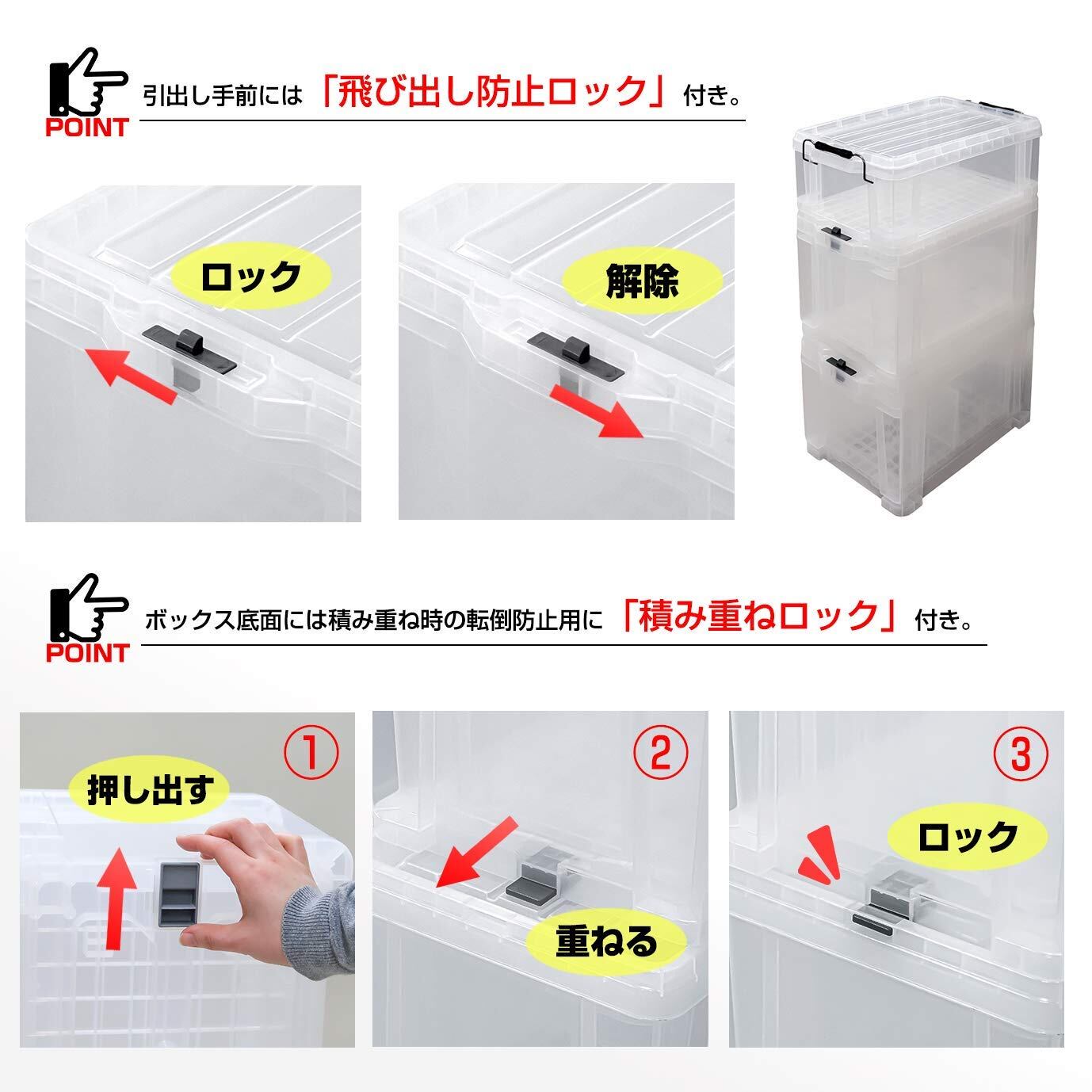 JEJアステージ 収納ボックス ロックストッカー #45 クリア 防災 幅37×奥行52×高さ32cm 製造国:日本 商品サイズ(約):W37×D51.8×H32.3cm 内寸(約):W26.8×D41×H24.4cm 商品重量:3.1kg 引き出しタイプのコンテナなので、積み重ねてもそのまま取り出し収納可能 ロック付き引き出しコンテナ。引き出しを引き出せばそのままコンテナとして使用可能です。