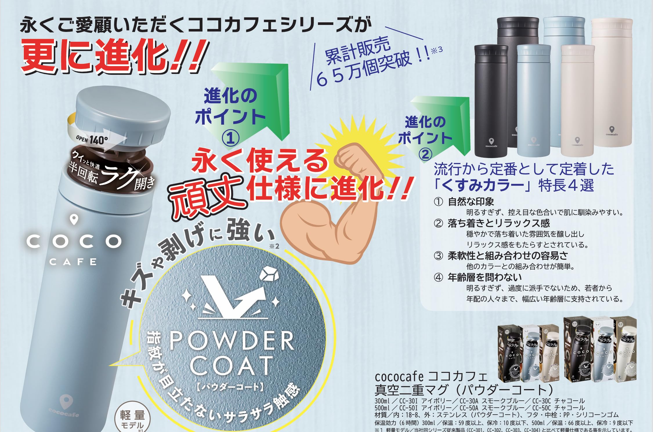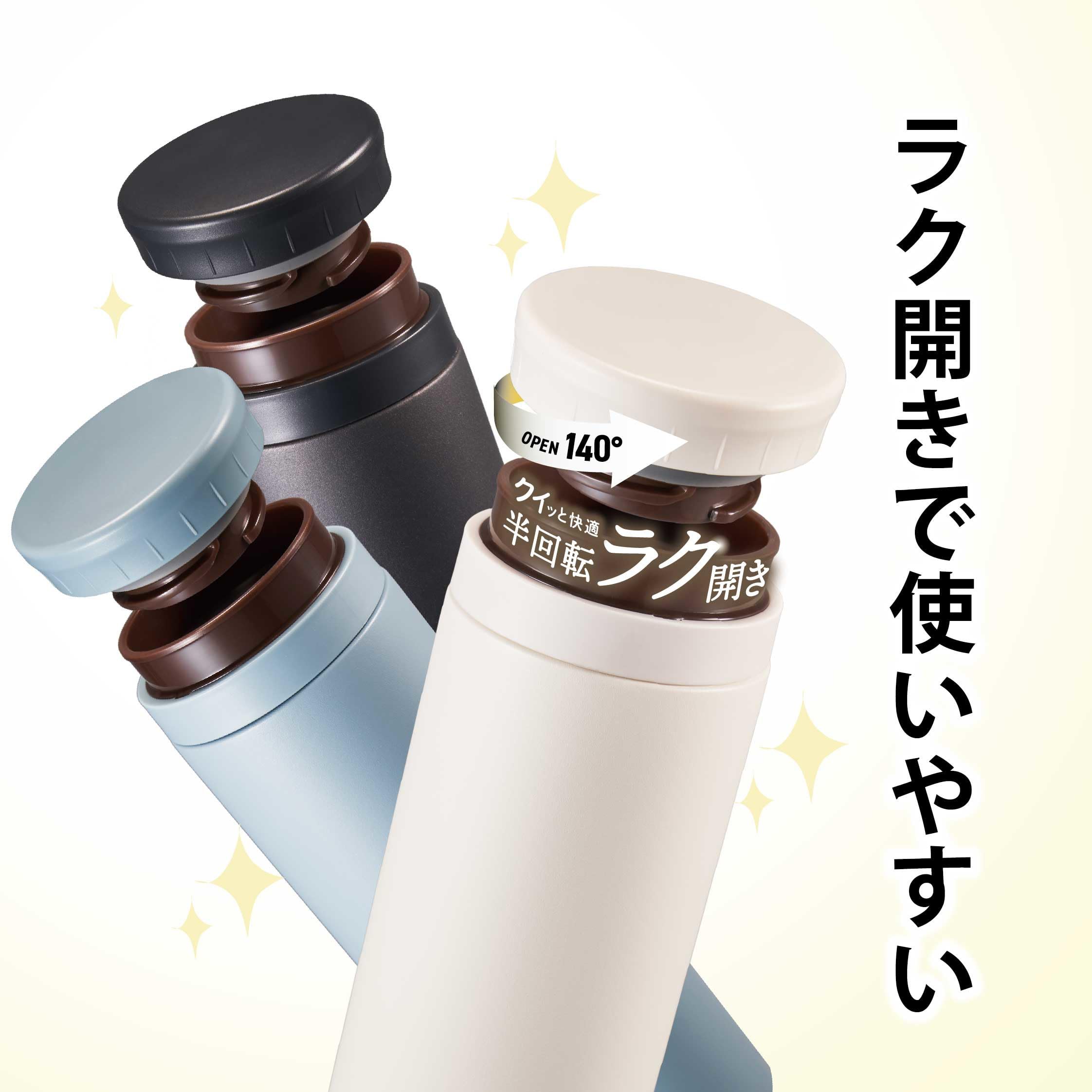 クルッと快適!半回転でラク開き!真空二重ボトルです。キズや?げに強いパウダーコーティング。