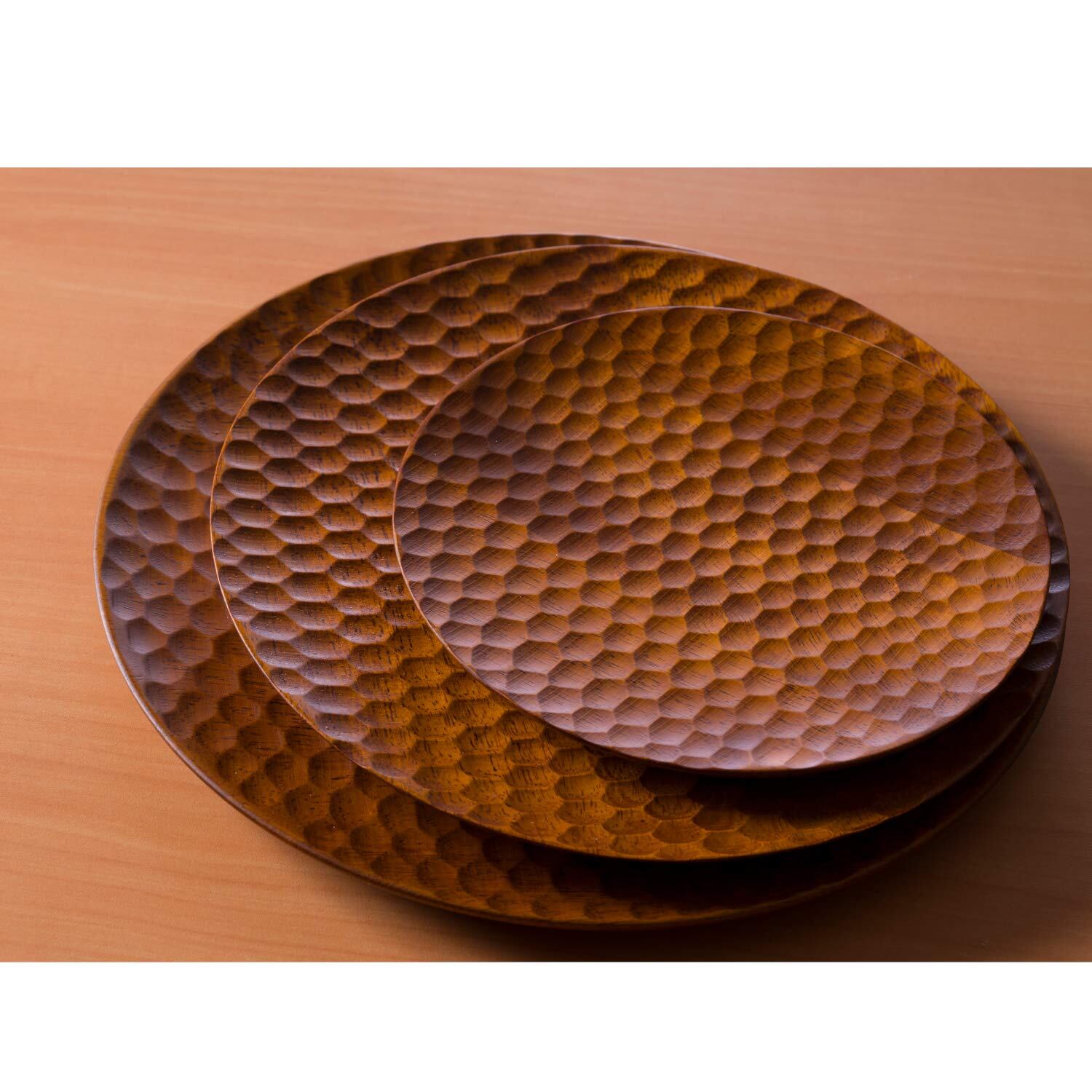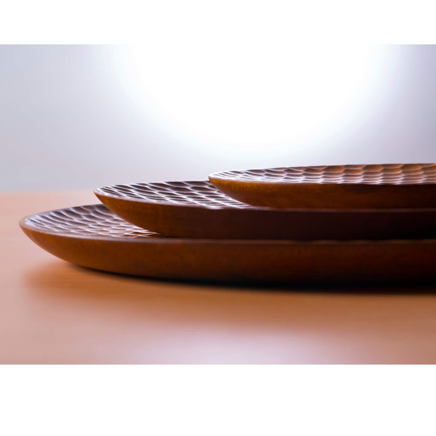 職人が丁寧に彫り上げた表面が特徴的なプレートです。パスタオイルやサラダのドレッシングが適度に油切りできます。